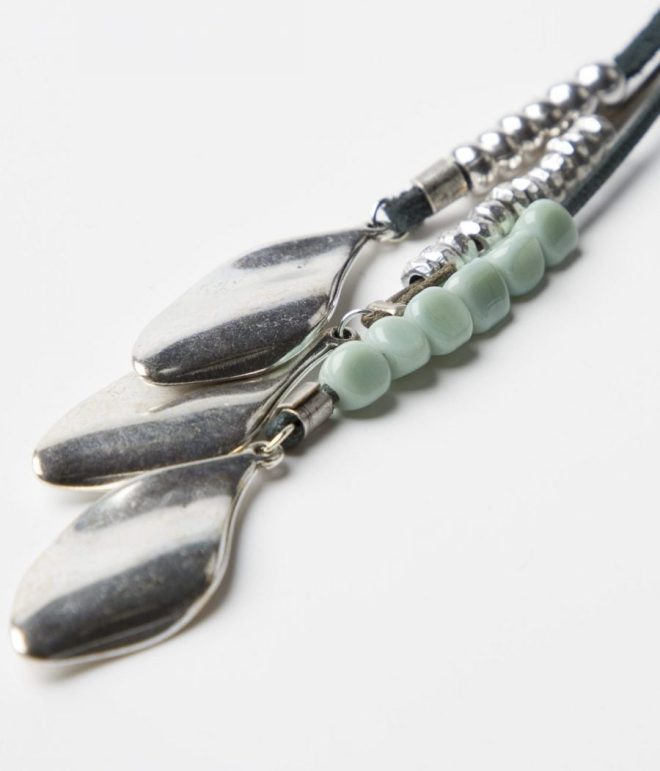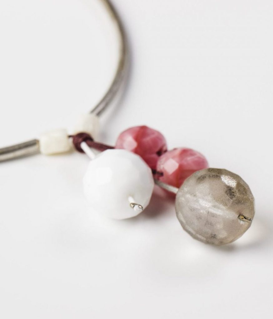 Collaret curt amb cinc tires molt fines de pell de cangur amb minerals, resines, peces de zamak amb bany de plata. Tanca del mateix material i cadena per ajustar la mida. Fet a mà.