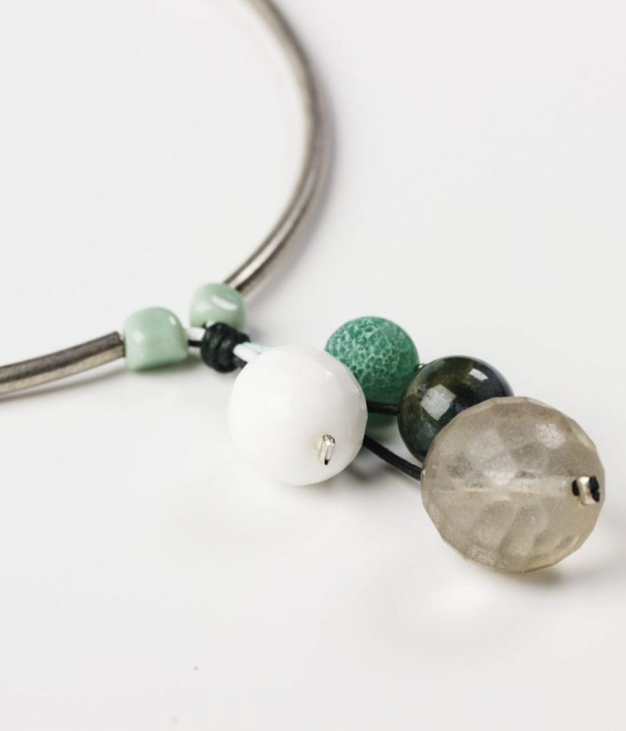 Collaret curt amb cinc tires molt fines de pell de cangur amb minerals, resines, peces de zamak amb bany de plata. Tanca del mateix material i cadena per ajustar la mida. Fet a mà.