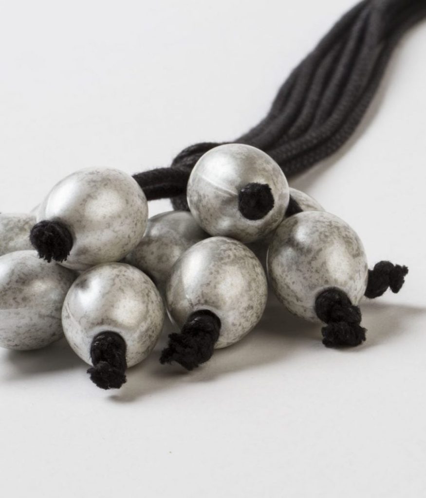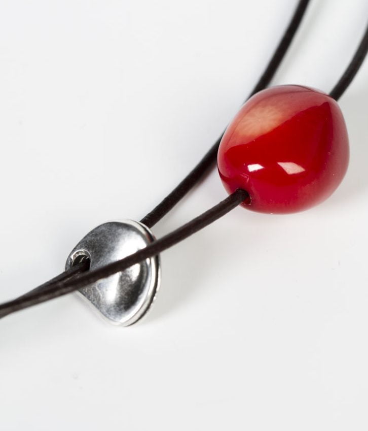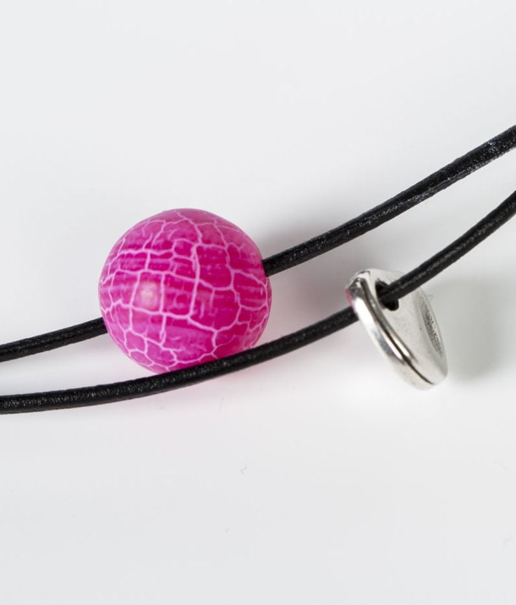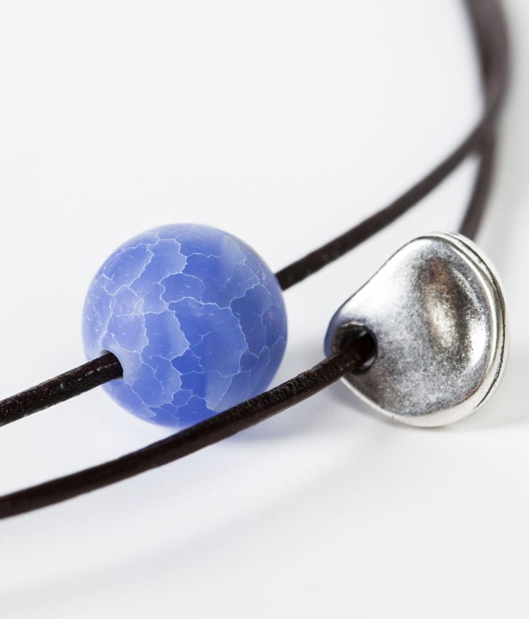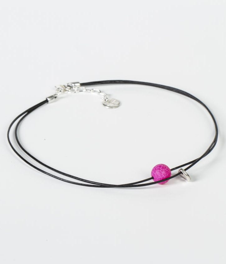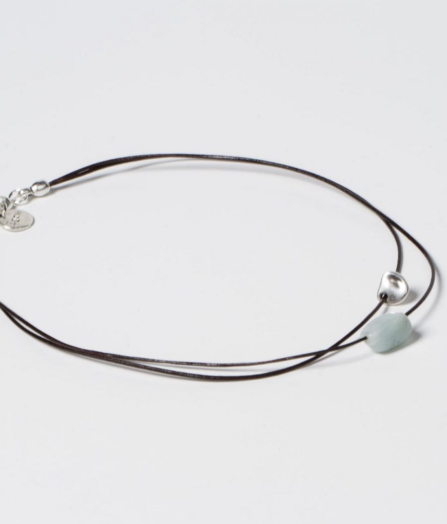 Collaret curt amb dues tires de pell de cangur, mineral i peça petita de zamak amb bany de plata. Molt juvenil. Tanca i cadena per ajustar la mida. Fet a mà.