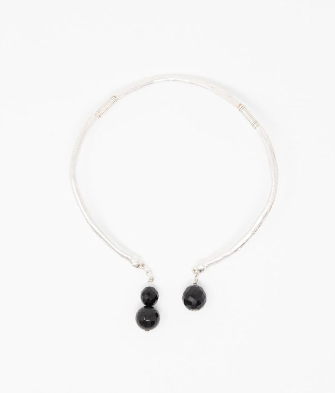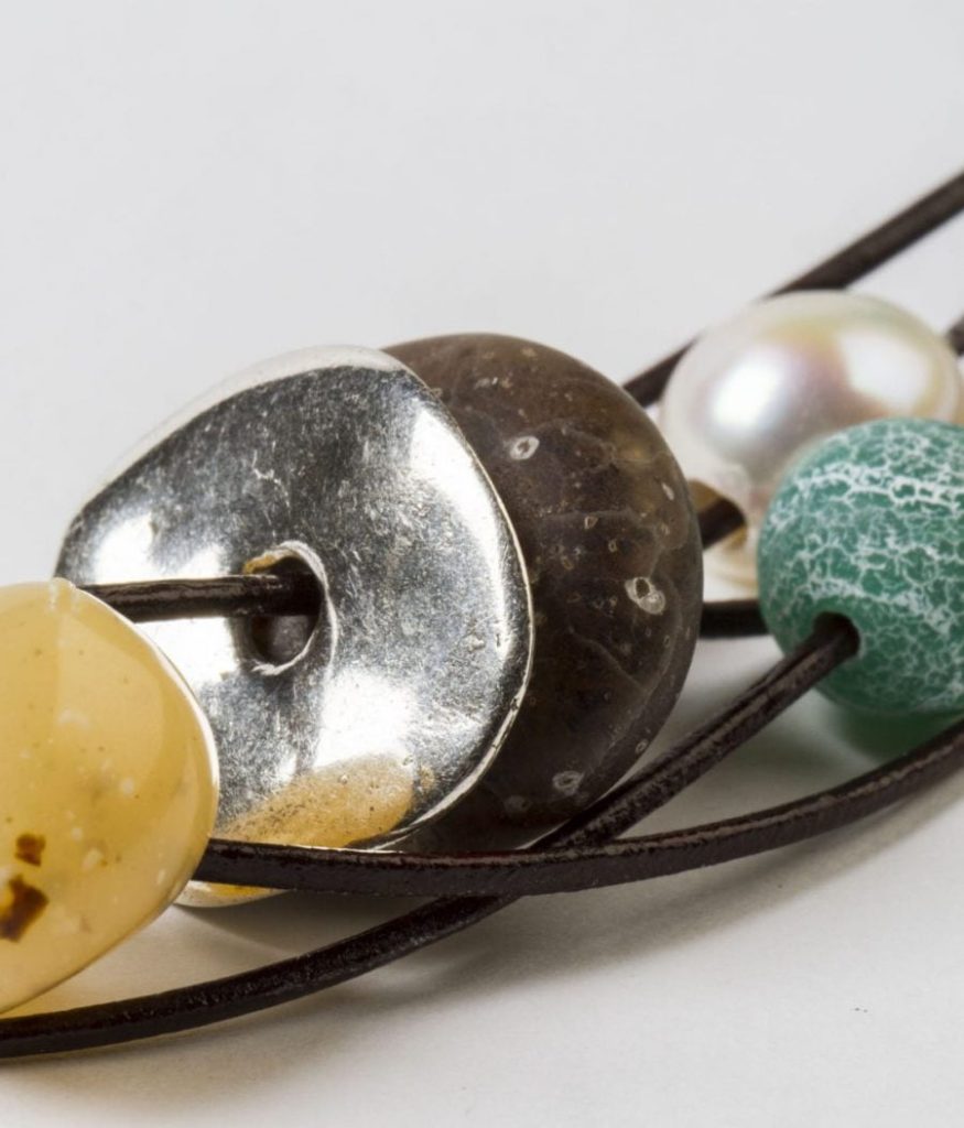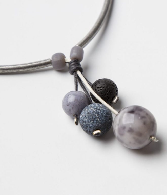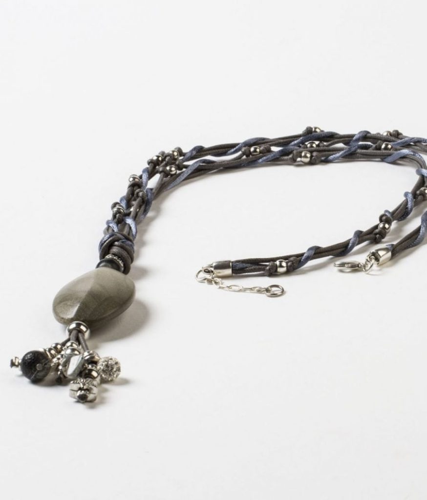 Collaret llarg de quatre tires d’antelina acabades en peces de resina i boletes de zamak banyades en plata. Fet a mà.