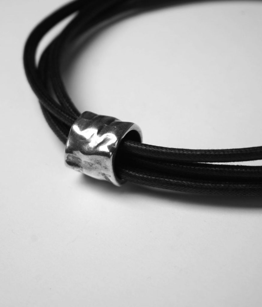 Collaret curt d’aire ètnic amb cuir gruixut negre, de 5 mm, peces i tanca de zamak amb bany de plata. Cadena per ajustar a la mida. Fet a mà.