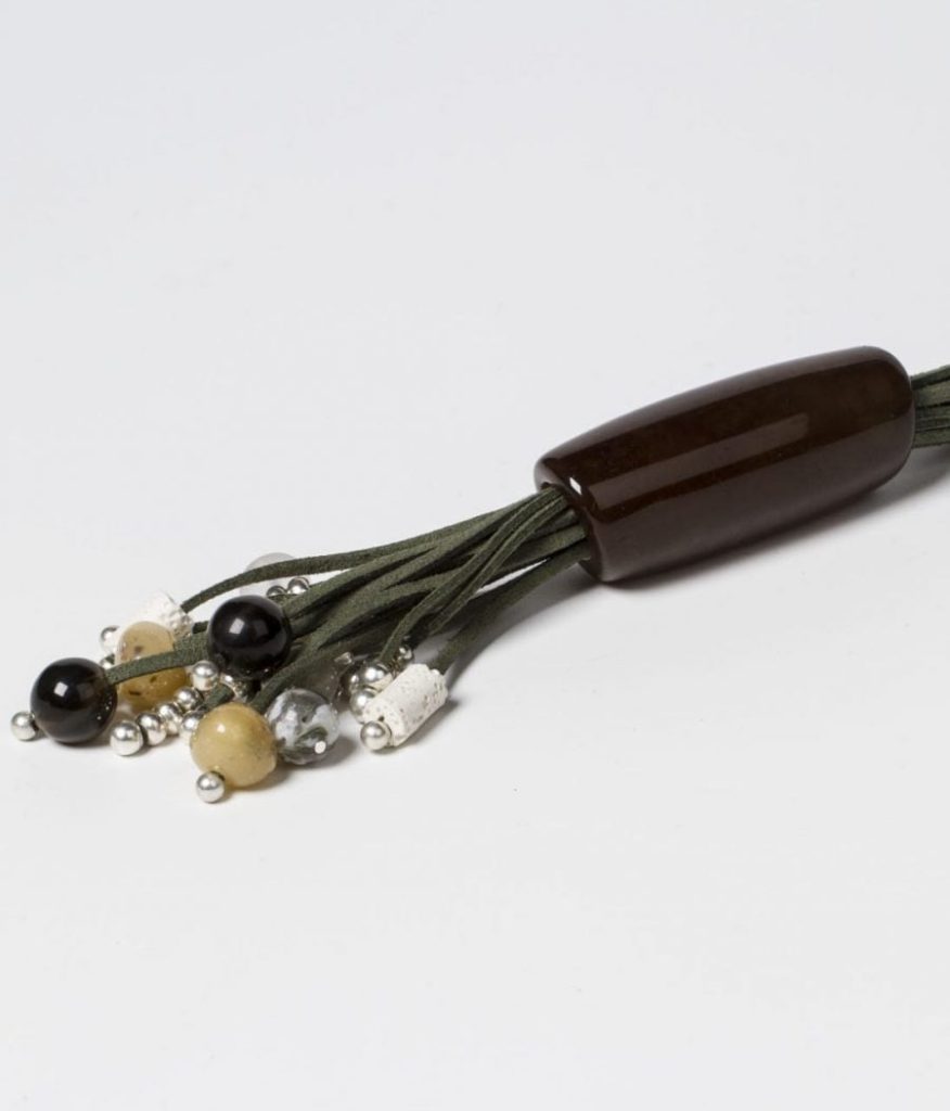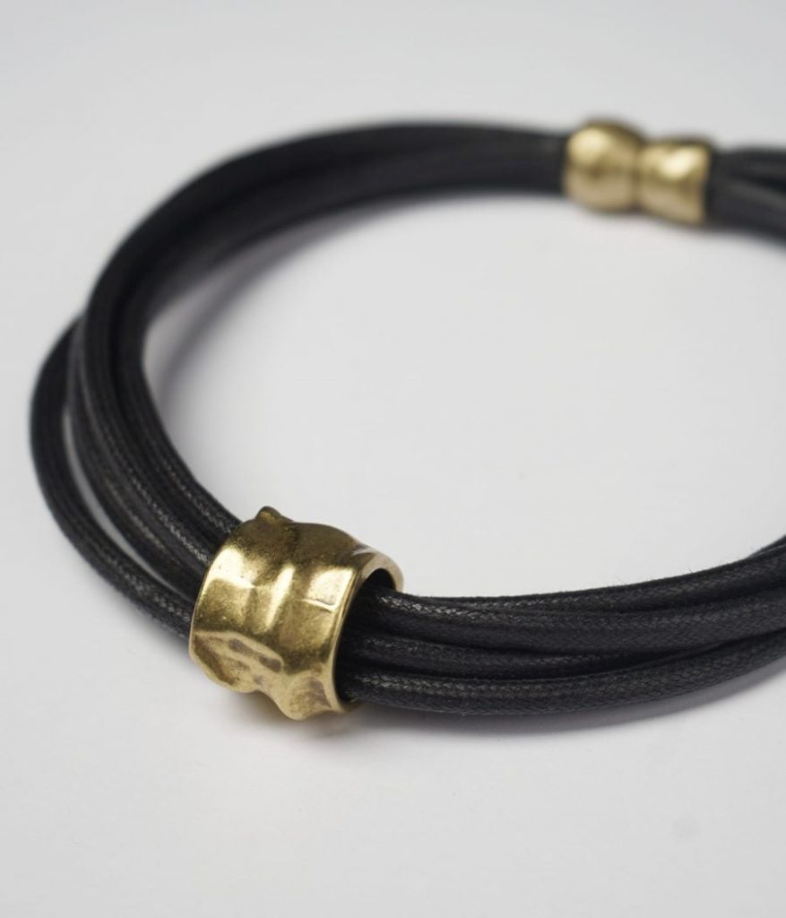 Collaret curt d’aire ètnic amb cuir gruixut negre, de 5 mm, peces i tanca de zamak amb bany de plata. Cadena per ajustar a la mida. Fet a mà.