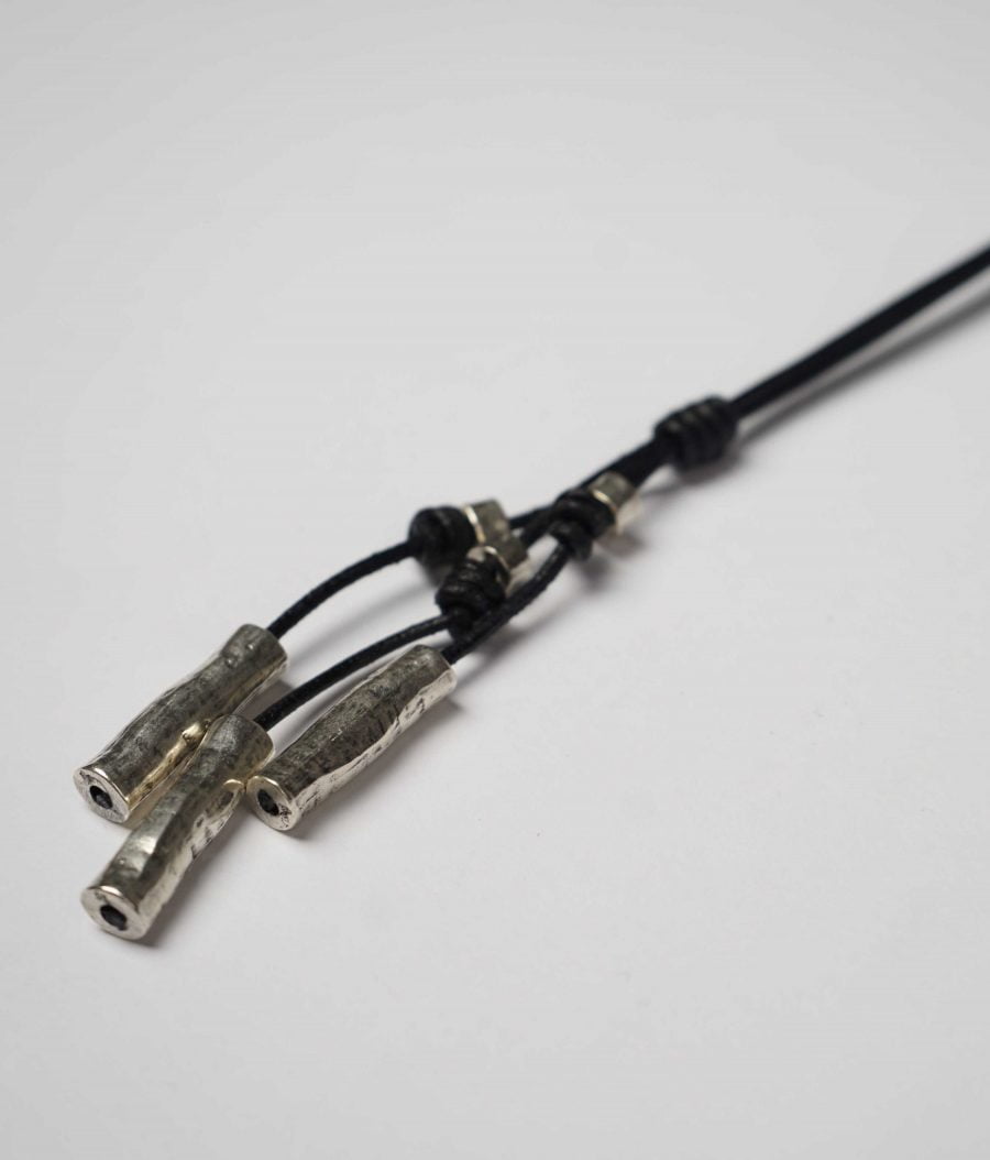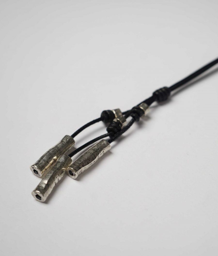 Collaret llarg de tres tires de cuir d’un mm, acabades en un cilindre de zamak banyat en plata. Kimiyo és un collaret molt fàcil de portar i de combinar. Fet a mà.