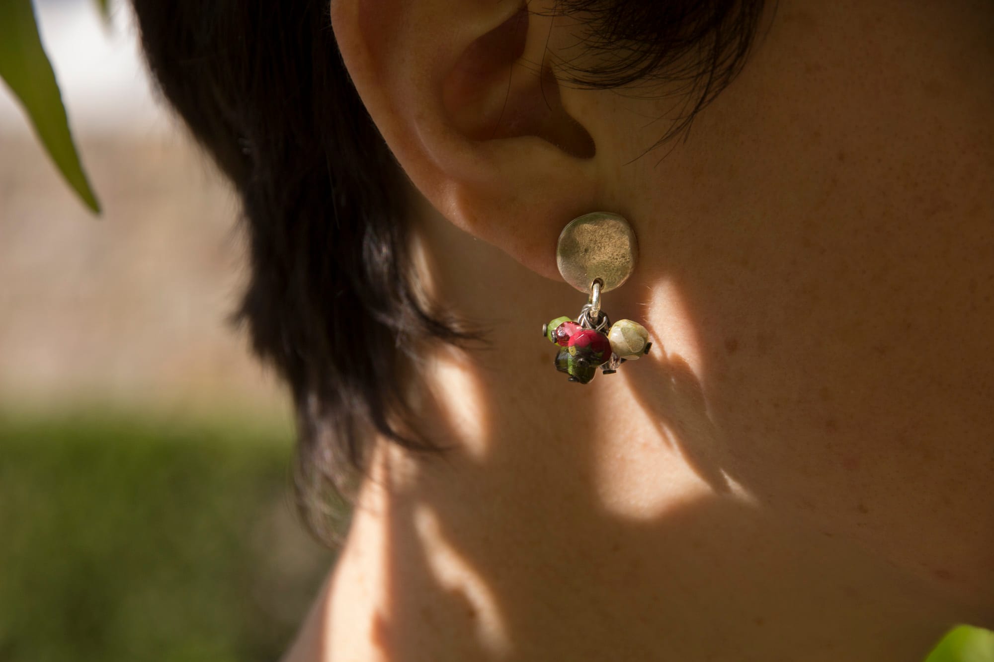 Arracades de zamak banyades en plata i resines en forma de raïm. Hi ha l’opció de tancament de clip, per a orella sense perforació, o l’opció estàndard per a orella perforada.. Fet a mà.