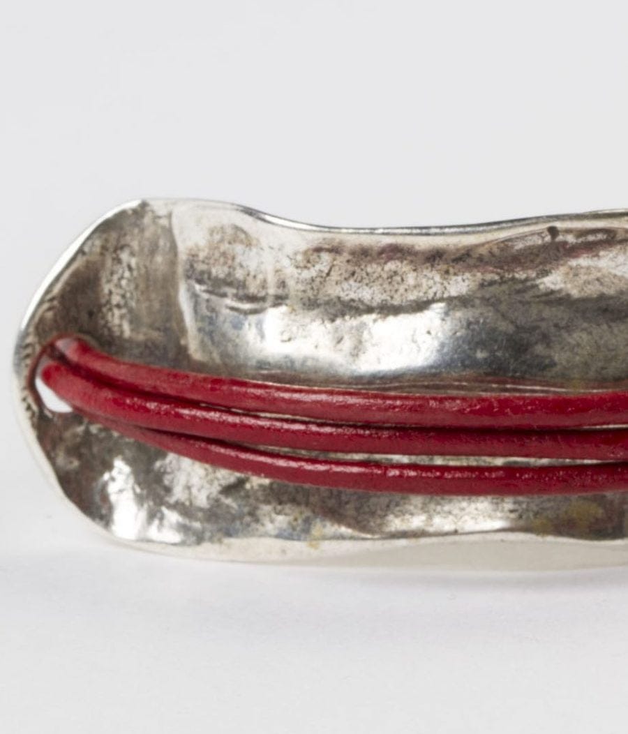 Bracelet with burgundy red leather on a silver-plated zamak rectangular curve piece. Magnetic clasp. Handmade.