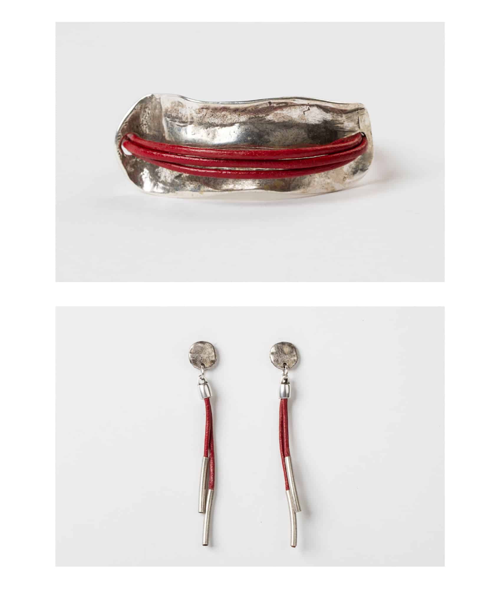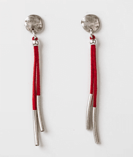 Long earrings with red leather and silver-plated zamak. Handmade.