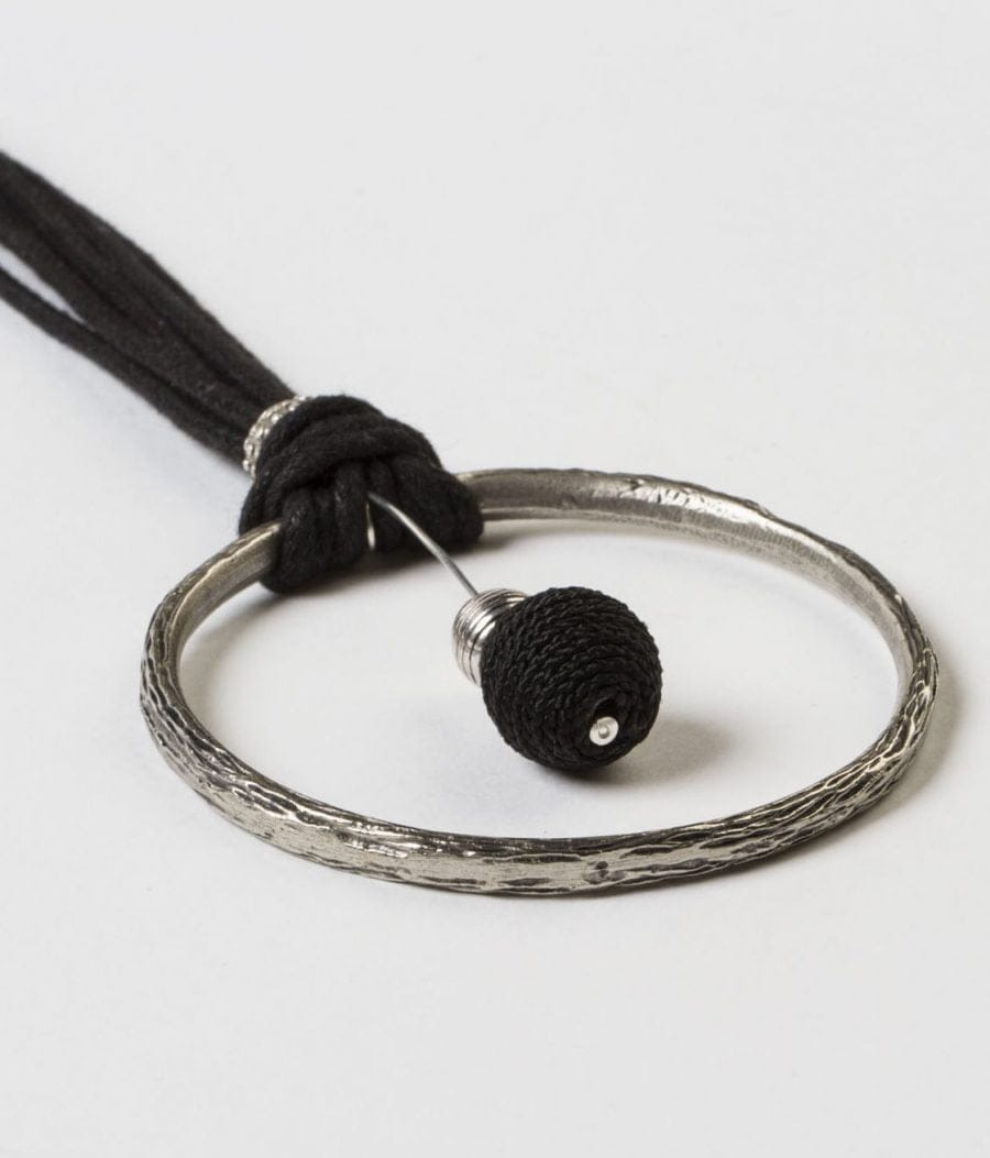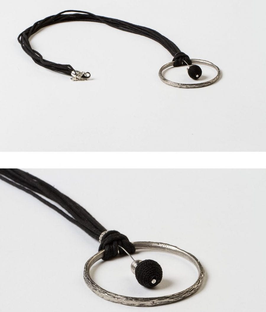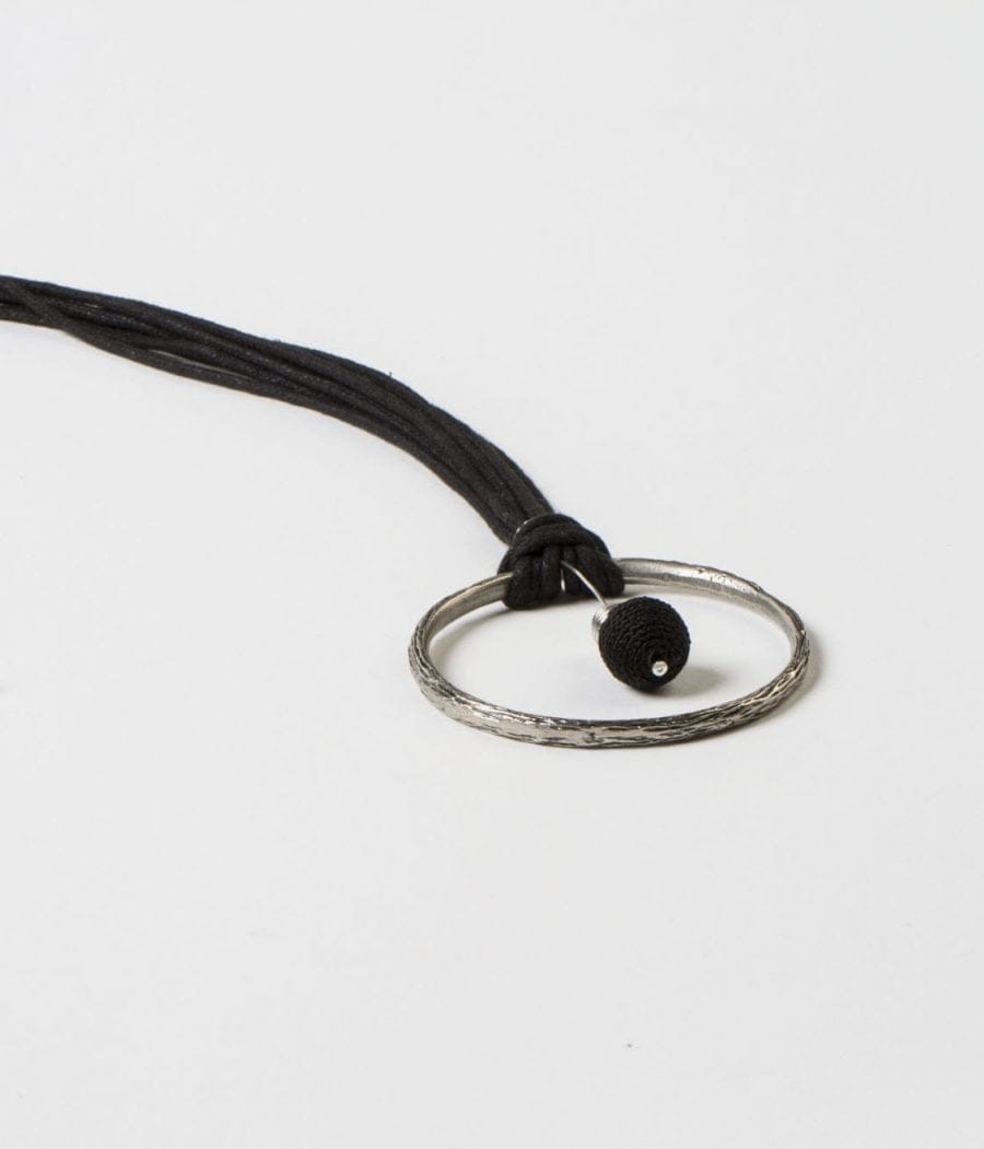 Long necklace with a big silver-plated zamak ring and a black bead in the center. Cotton strands. Clasp and chain to adjust the length. Handmade.