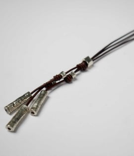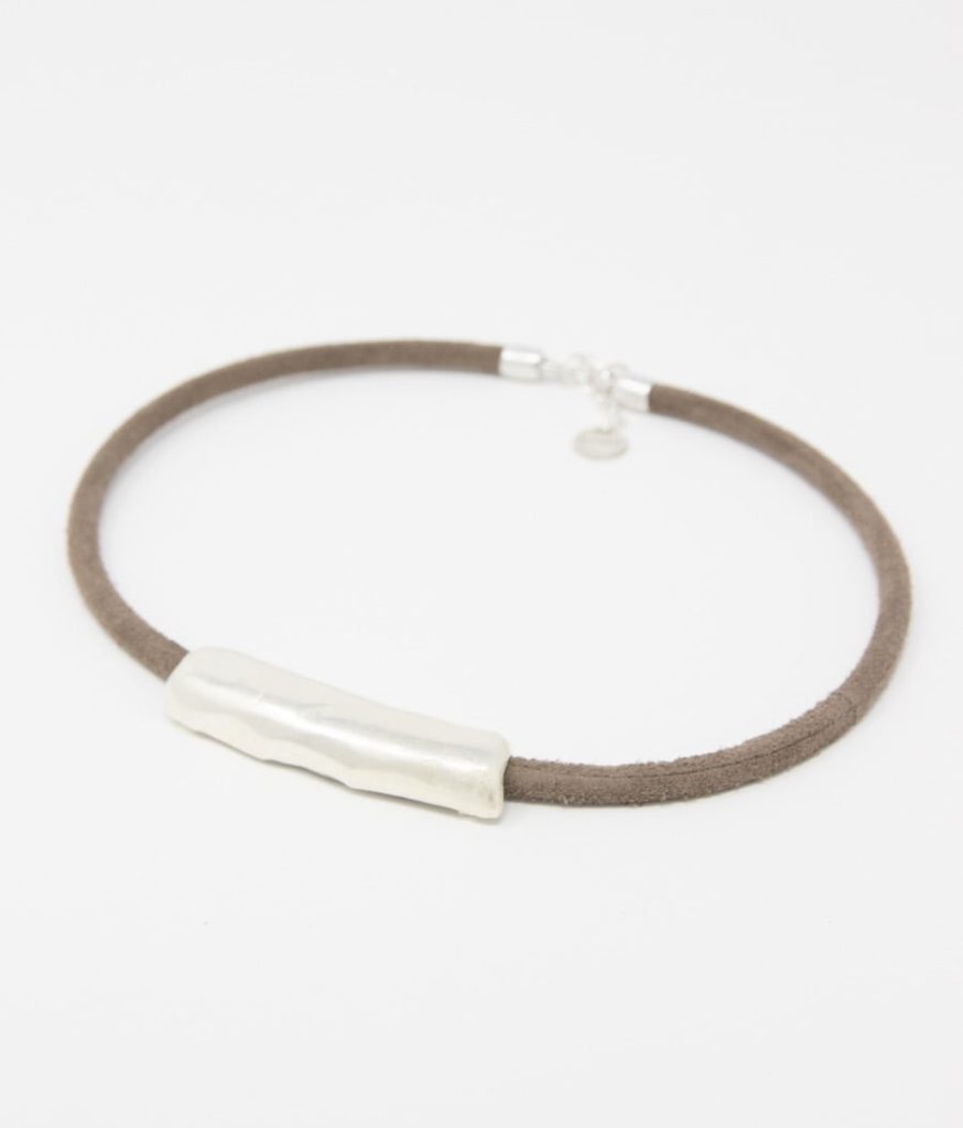 Its clean design enhances the elongated shape of the cut-out pendant, creating a light and refined piece. The gold or silver plating adds an elegant shine that pairs easily with styles ranging from casual to formal. Handmade, this choker embodies the essence of a unique and timeless piece of jewelry.