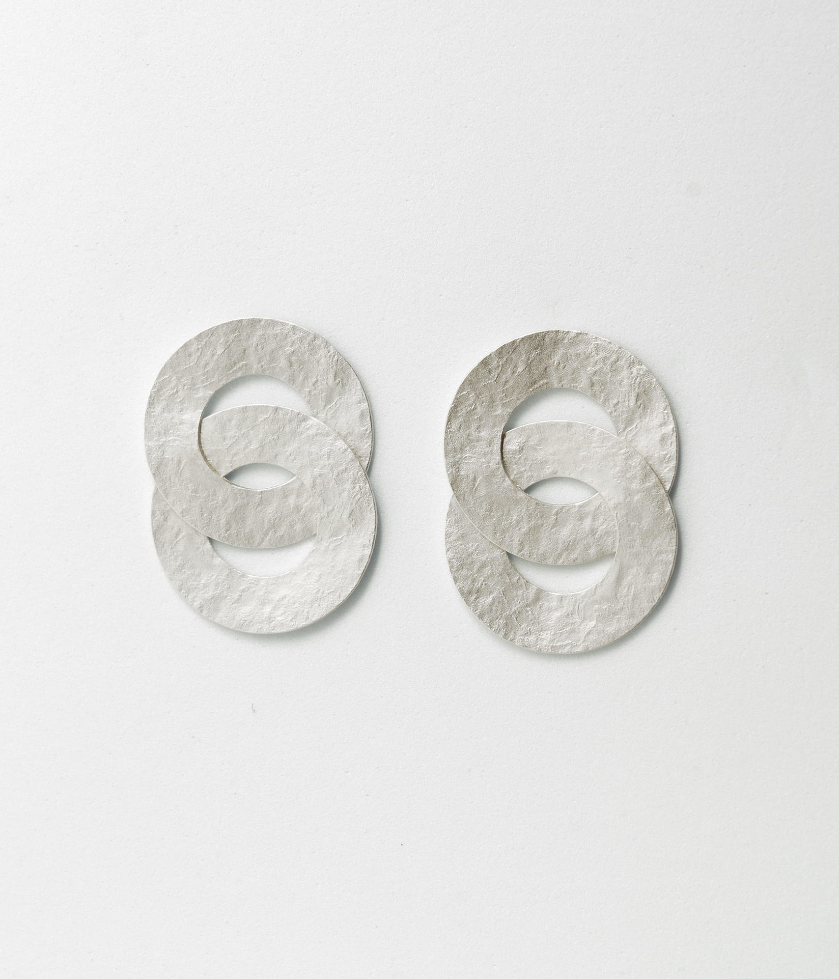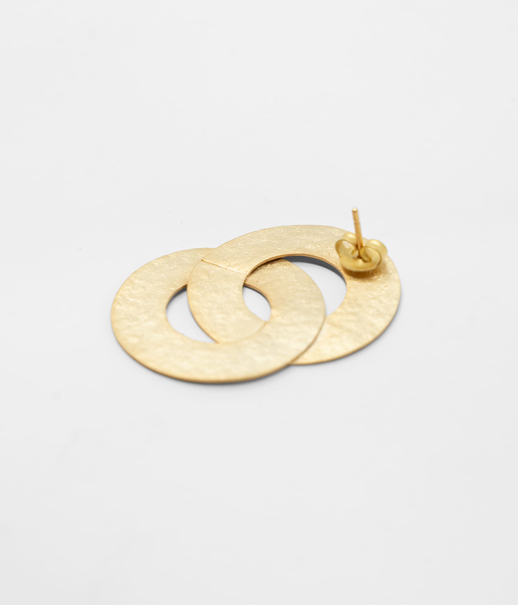 Pendientes compuestos por dos círculos planos entrelazados con acabado martelé. Disponibles con baño en oro o plata, según el modelo.