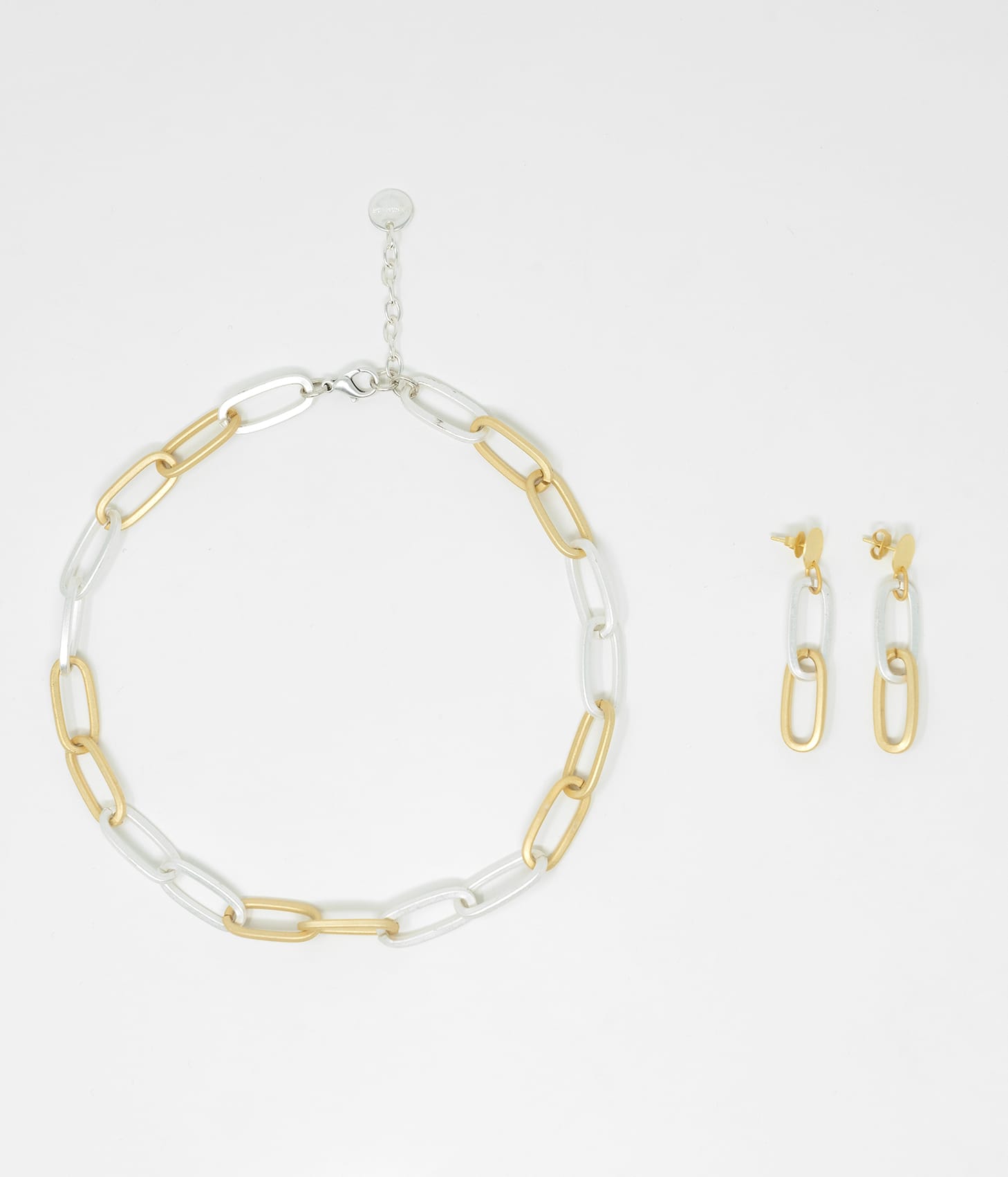Set de collar y pendientes bicolor en zamak bañado en oro y plata. Diseño elegante y versátil. Los pendientes pueden pedirse con cierre estándar o cierre de clip.
