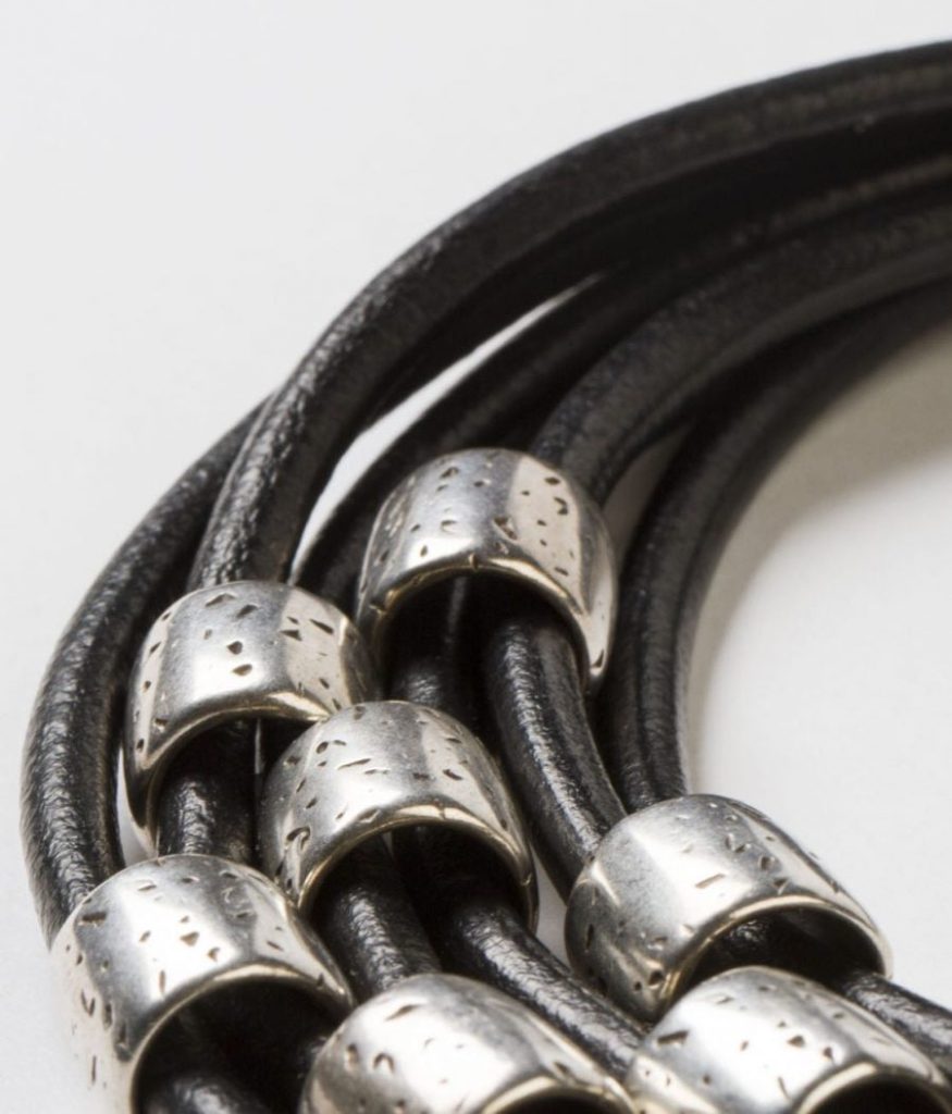 Collar corto de piel de canguro de cinco tiras adornadas con minerales, resinas, perla de rio y piezas de zamak bañadas en plata. Cadena para ajustar la medida y cierre también de zamak bañado en plata.
