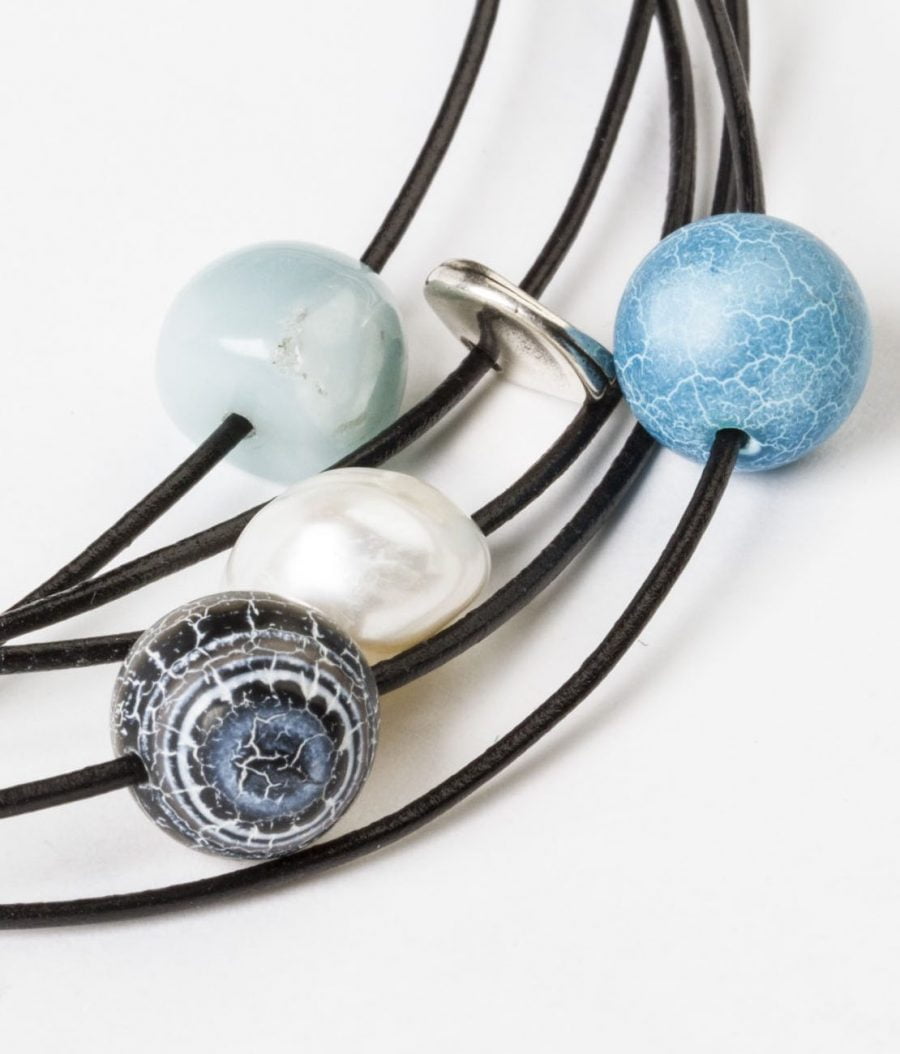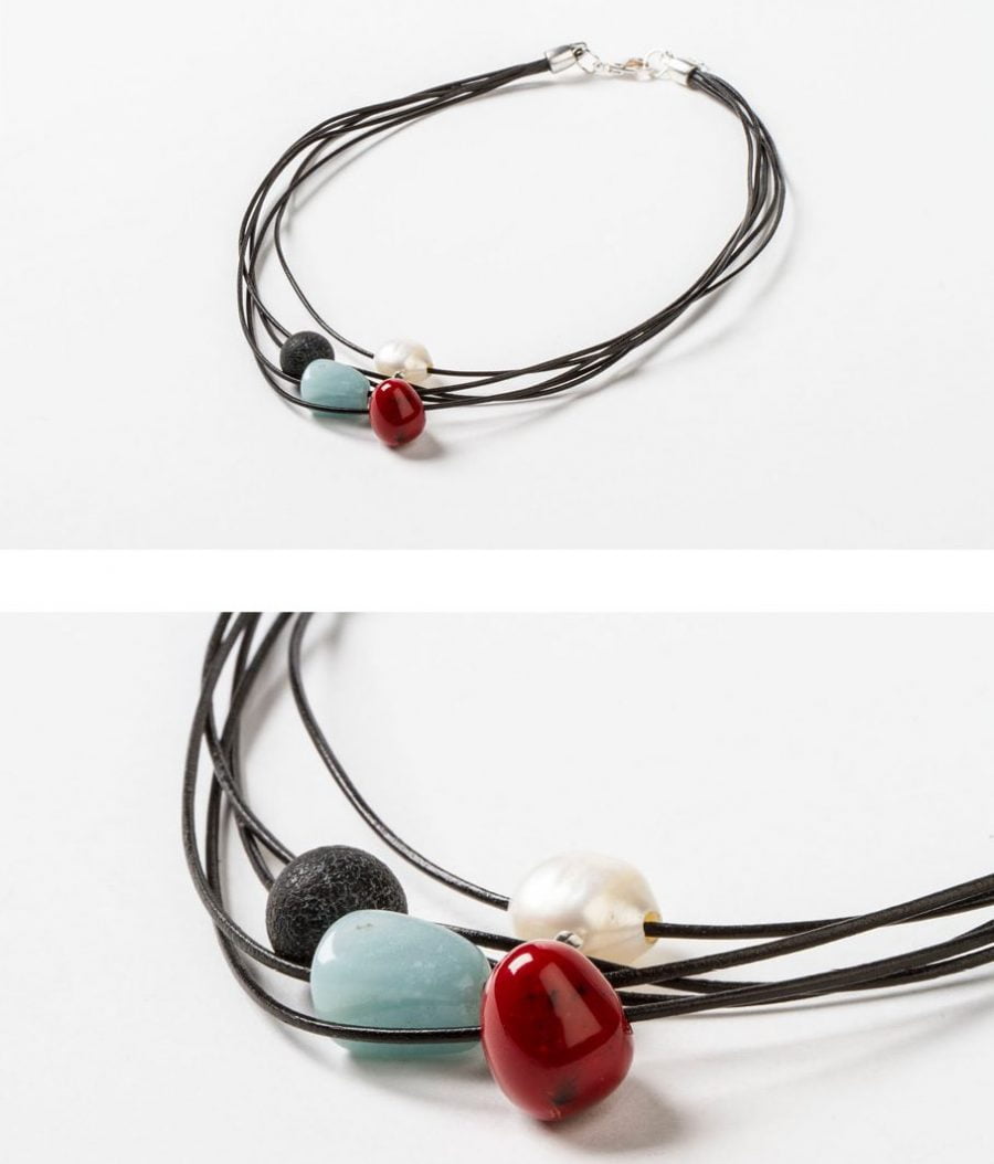 Collar corto de piel de canguro de cinco tiras adornadas con minerales, resinas, perla de rio y piezas de zamak bañadas en plata. Cadena para ajustar la medida y cierre también de zamak bañado en plata.