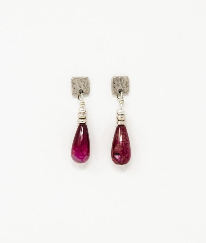 Pendientes largos de zamak con baño de plata, ágata y resinas. Existe la opción cierre de clip, para oreja sin perforación, o la opción estándar para oreja perforada.