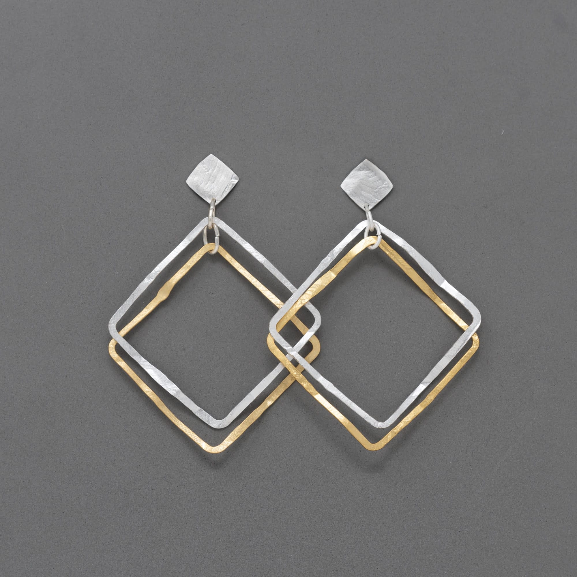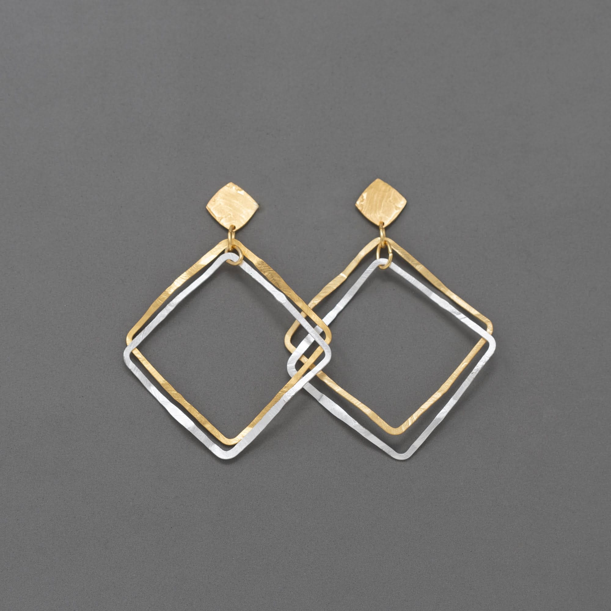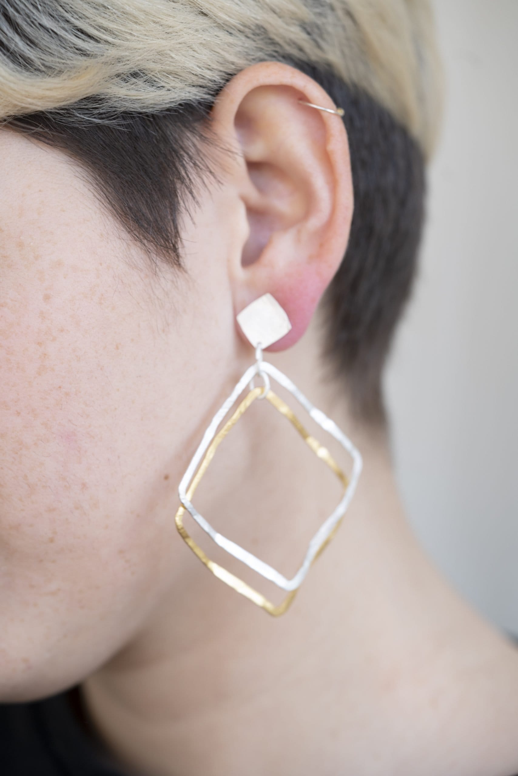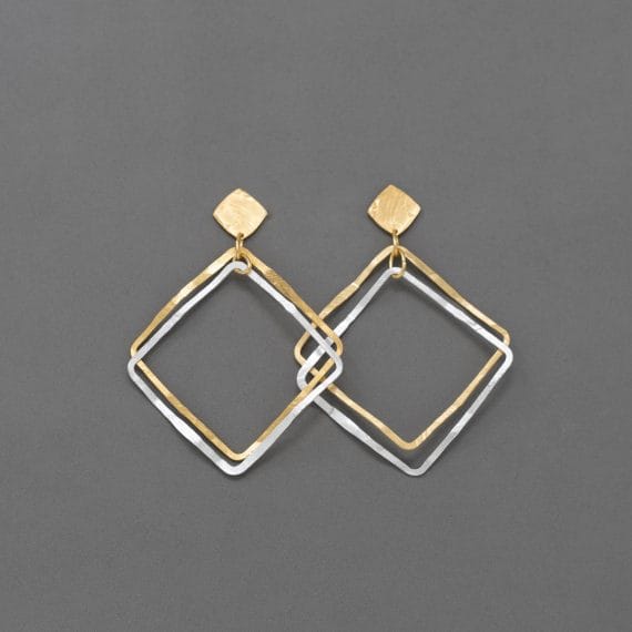 Pendientes de doble pieza cuadrada elaborados en metal bañado en oro y plata. Disponibles en dos combinaciones: con la base en oro y la pieza superior en plata, o al revés. Son muy ligeros, cómodos de llevar y están disponibles tanto con cierre de clip (para orejas sin perforación) como con el cierre estándar para orejas perforadas.