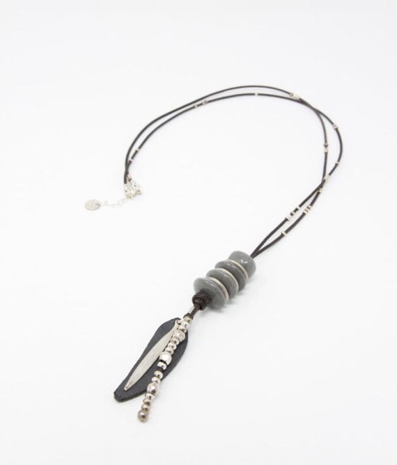 Collar largo con piezas de de cerámica fabricadas artesanalmente, una hoja de piel y piezas de zamak bañadas en plata. Cordón de cuero. Cierre y cadena para ajustar la medida también de zamak bañado en plata.
