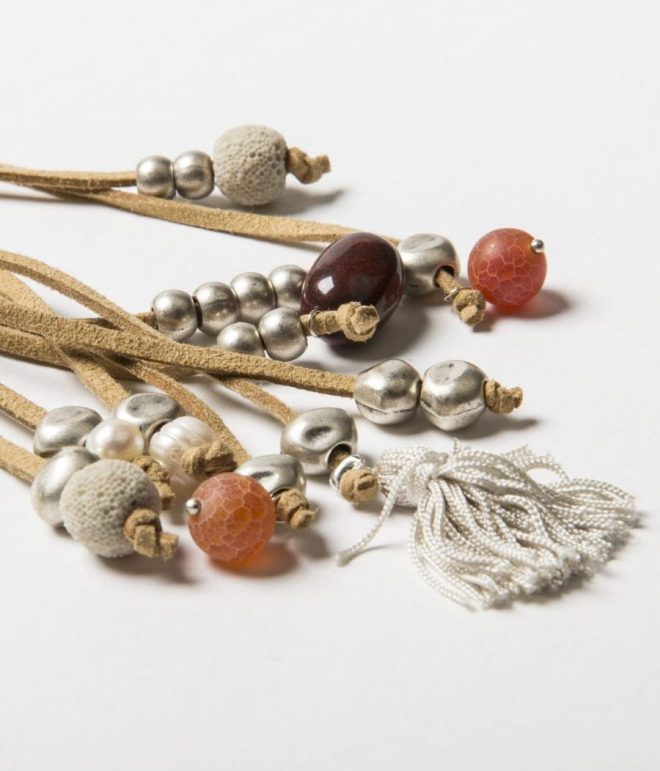 Las joyas Egass están elaboradas con materiales de alta calidad, incluyendo metales chapados en oro y plata, piedras naturales, abalorios, resina, cuero y zamak.