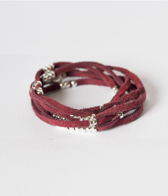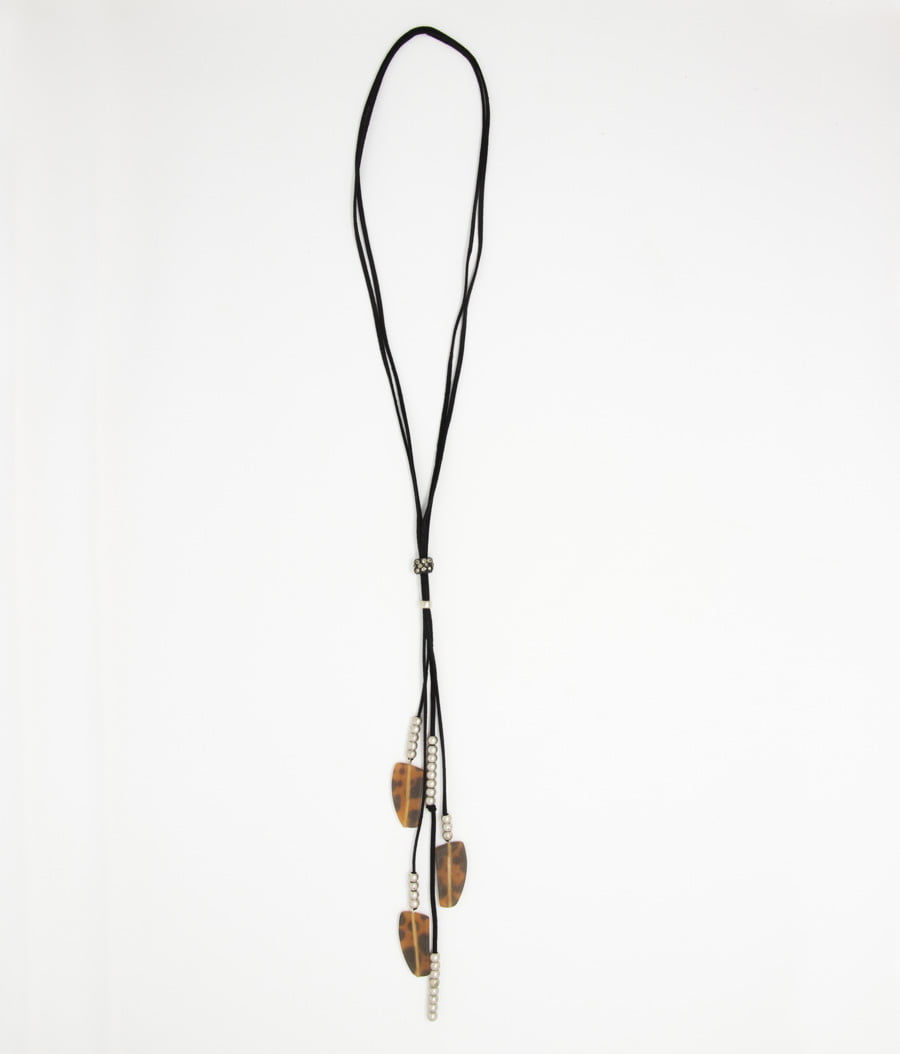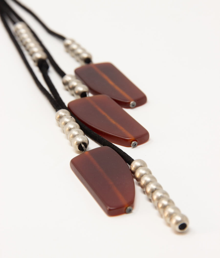 Collar largo de cuatro tiras de antelina terminadas en piezas de resina i bolitas de zamak bañadas en plata.