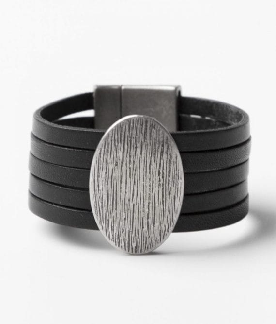 Pulsera elaborada con varias tiras de cuero plano que se adaptan cómodamente a la muñeca, creando un efecto ancho y moderno. En el centro destaca una pieza ovalada de zamak bañado en plata, con textura grabada que aporta personalidad y un acabado artesanal. El cierre, también en zamak bañado en plata, asegura un ajuste firme y práctico.