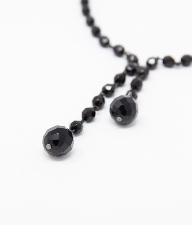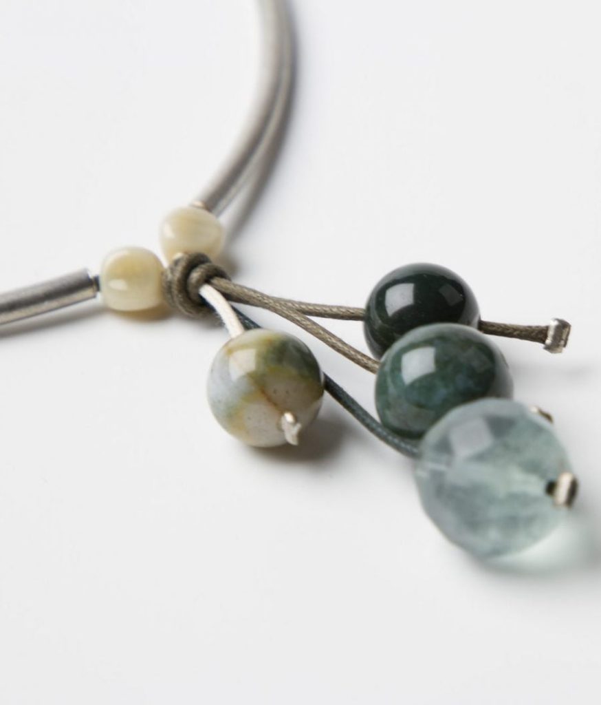 Collar largo, de antelina y algodón de diferentes grosores adornado con bolas de resina. Nudo central terminado en ramillete de hojas de zamak bañado en plata.