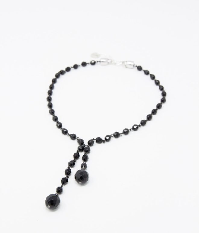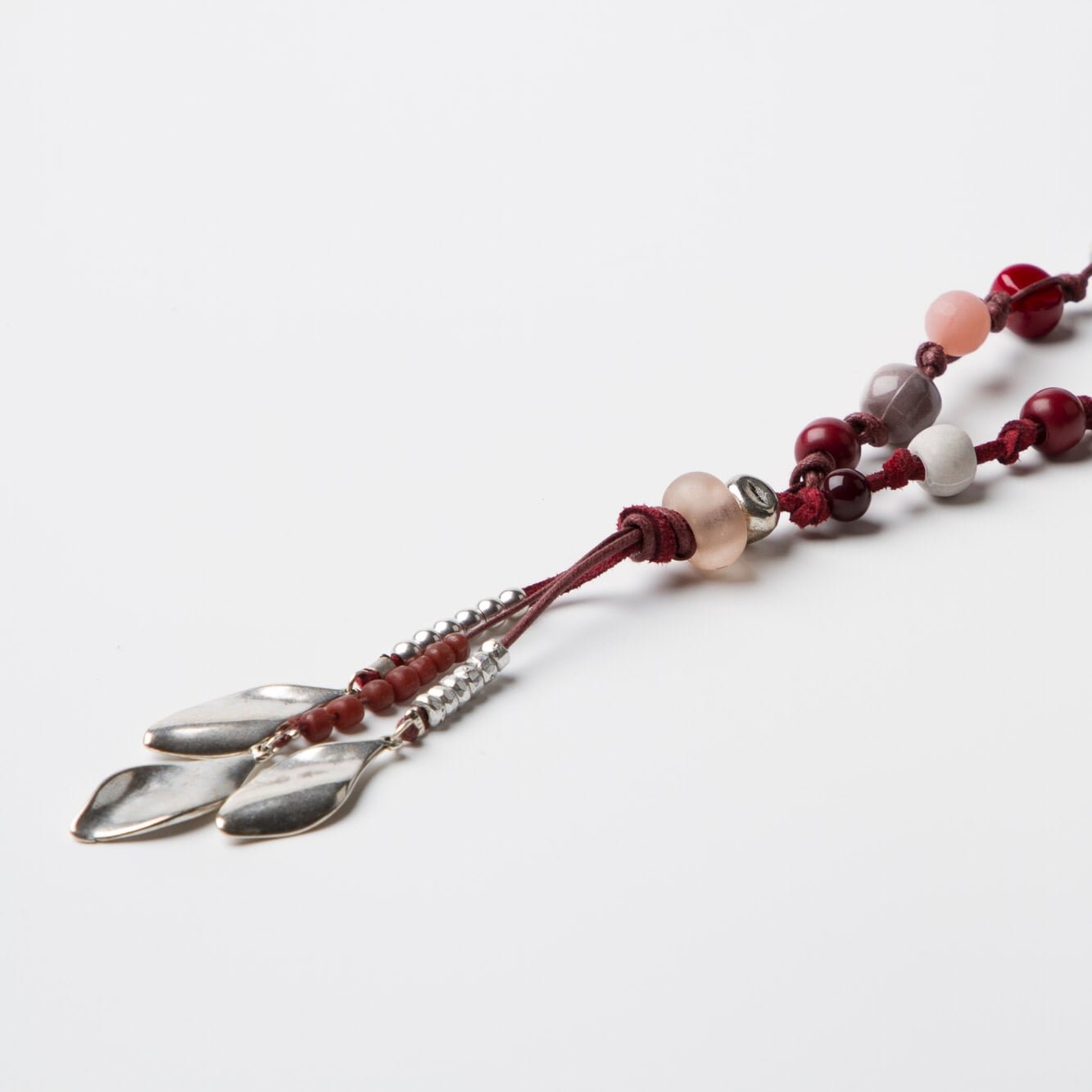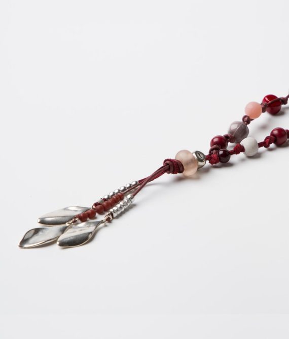 Collar largo, de antelina y algodón de diferentes grosores adornado con bolas de resina. Nudo central terminado en ramillete de hojas de zamak bañado en plata.