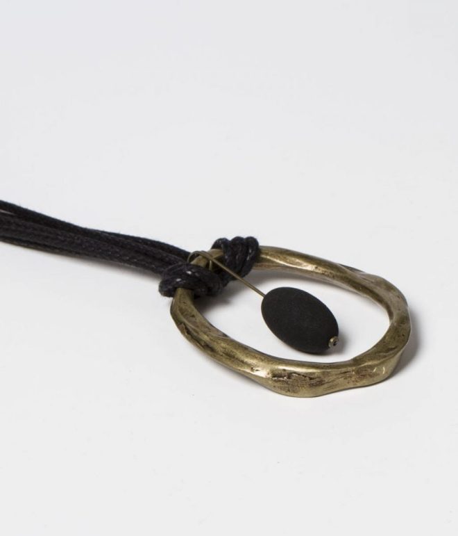 Collar corto de cinco tiras de algodón negro grueso con anillo grande en el centro de zamak bañado. Cierre de imán del mismo material.