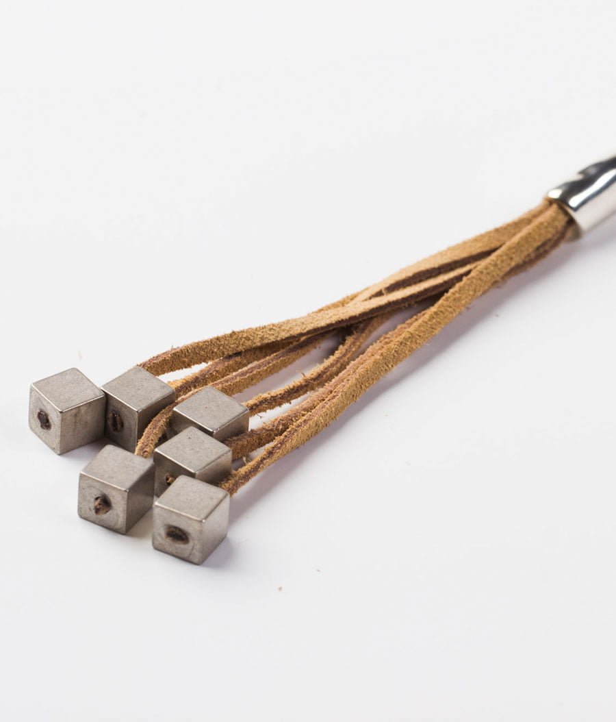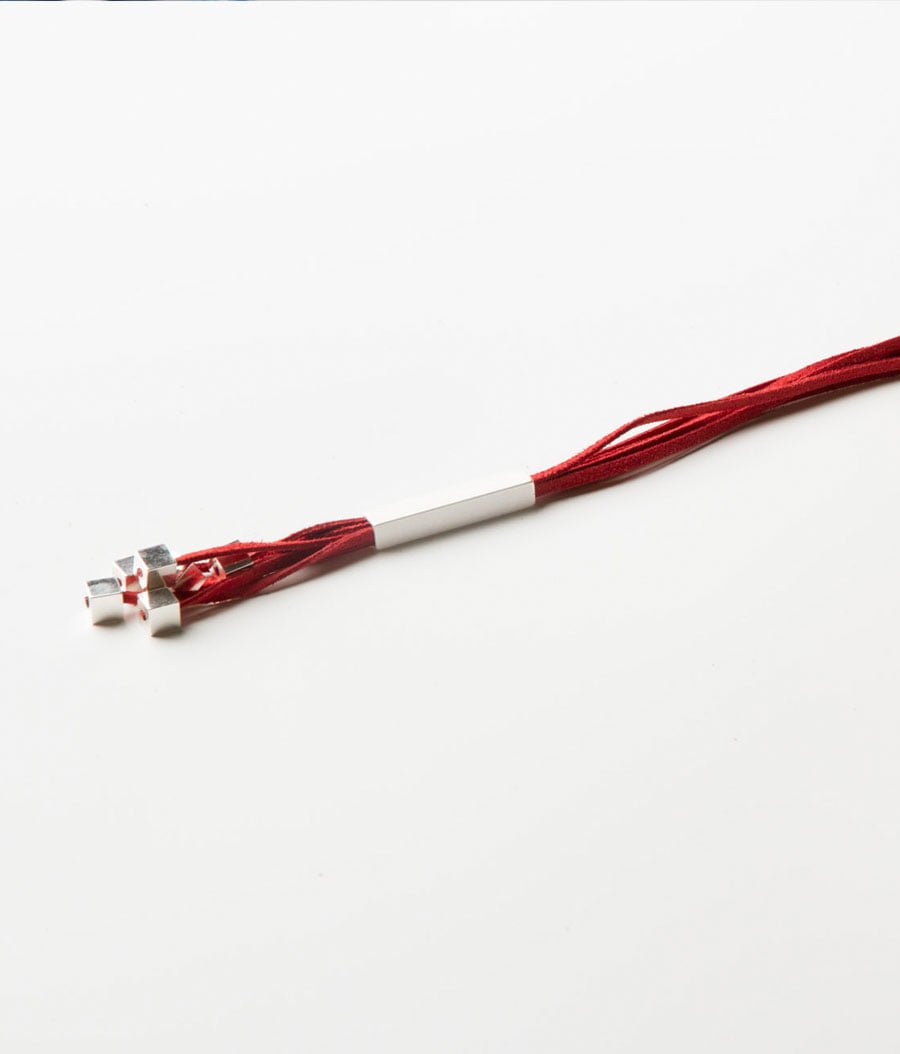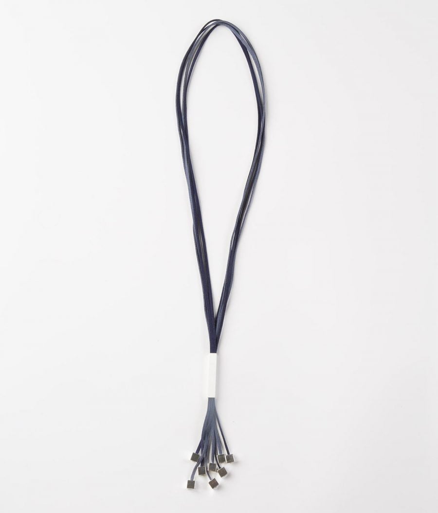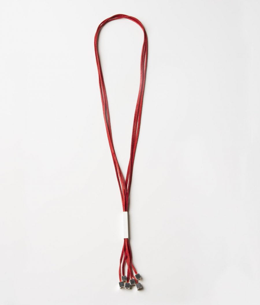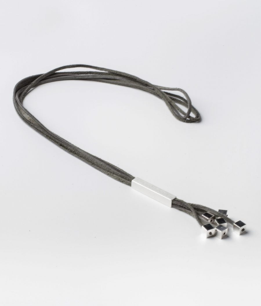Collar largo con tiras de antelina sujetas por un prisma rectangular y terminadas en cubos de zamak bañados en plata. Este modelo, es un collar muy fácil de llevar y combinar con diferentes looks.
