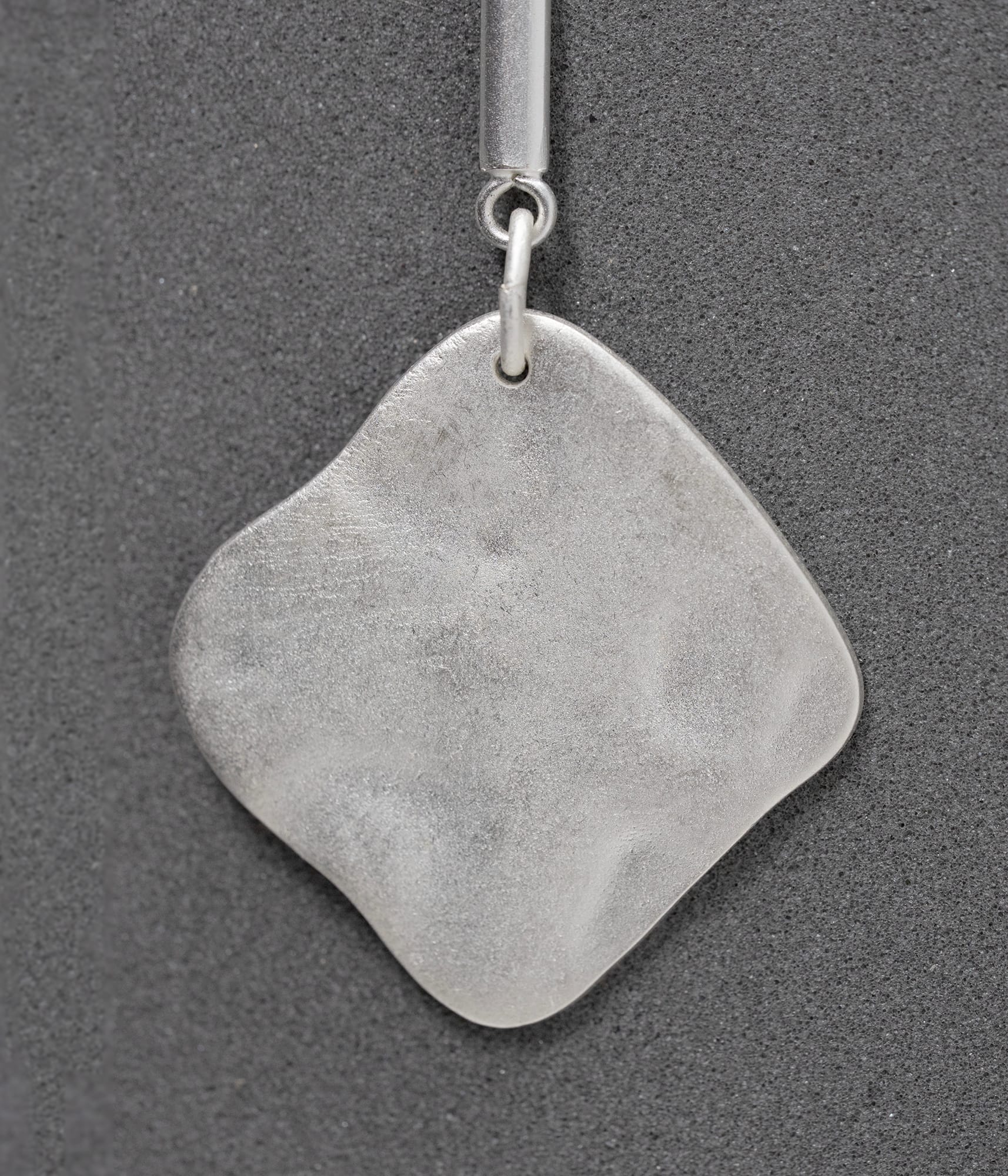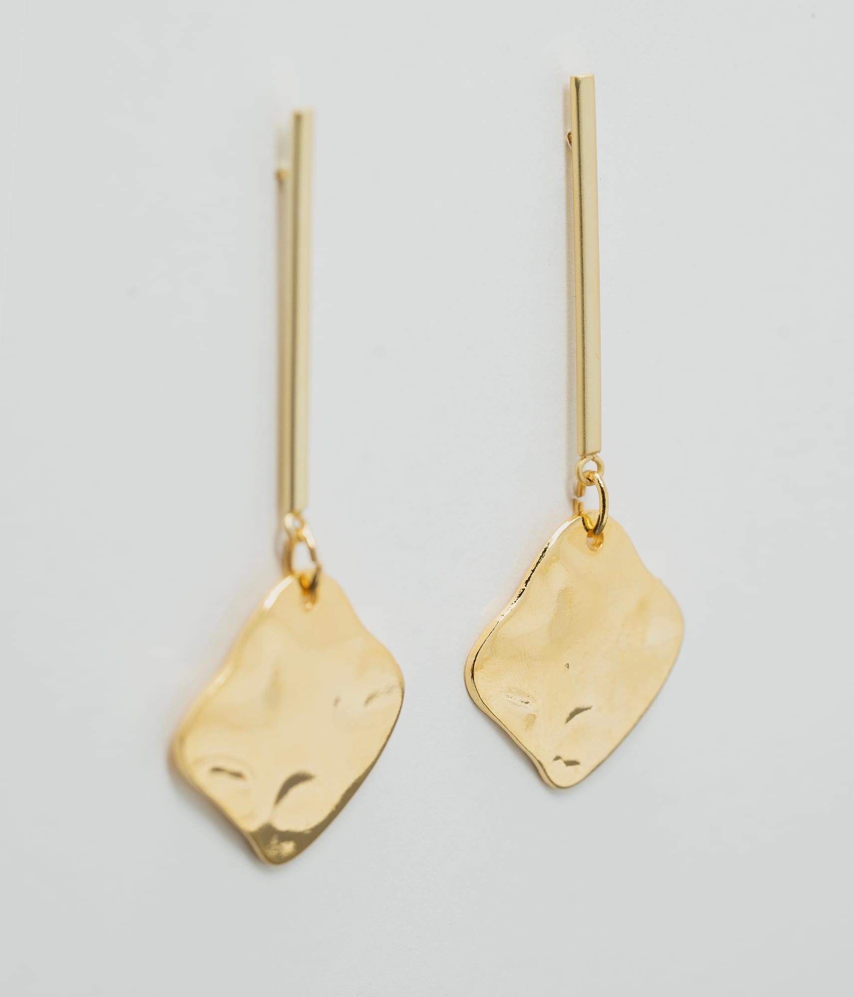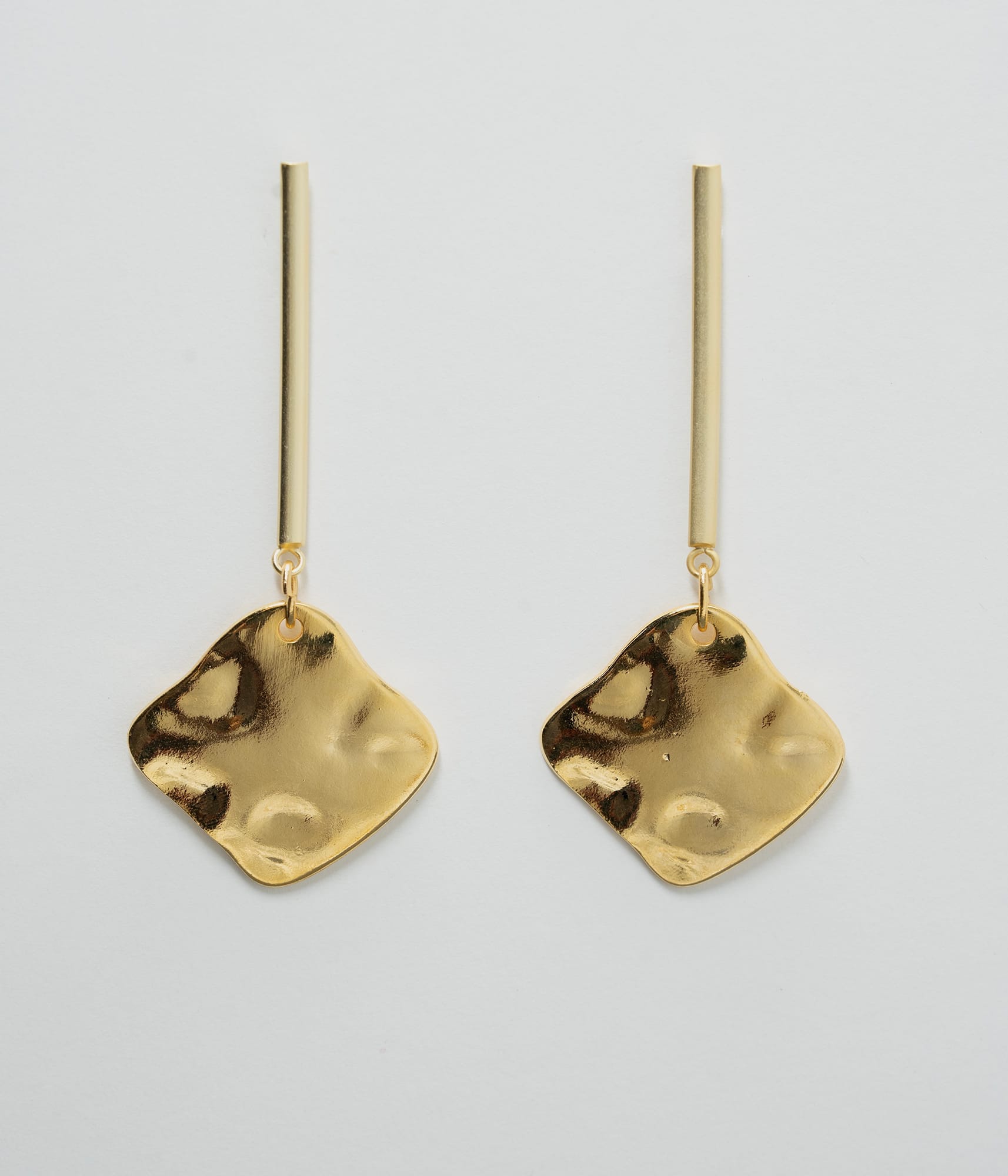 Pendientes largos compuestos de una barra estilizada que termina en una pieza cuadrada. Baño galvánico y acabado en oro o plata según modelo.