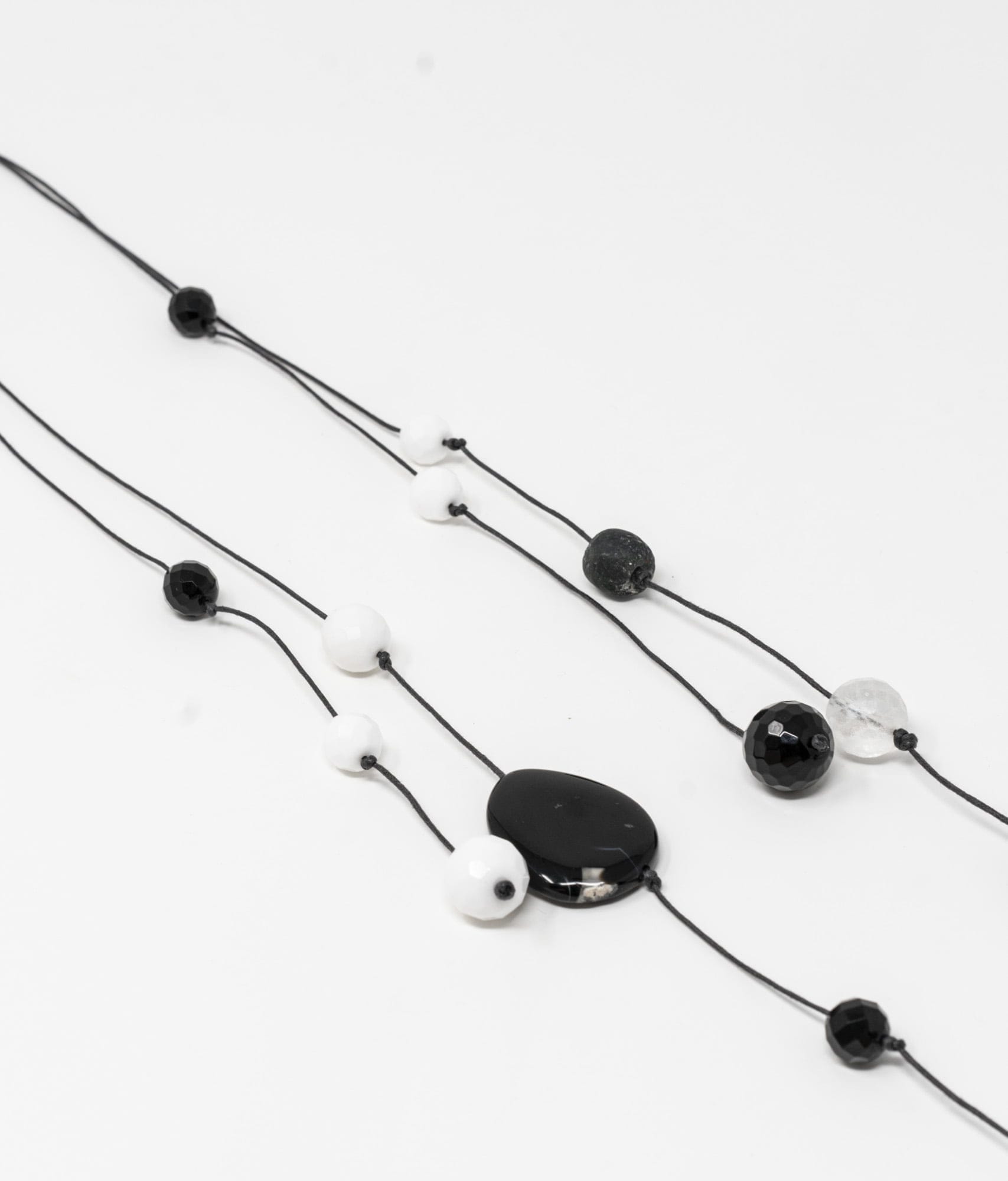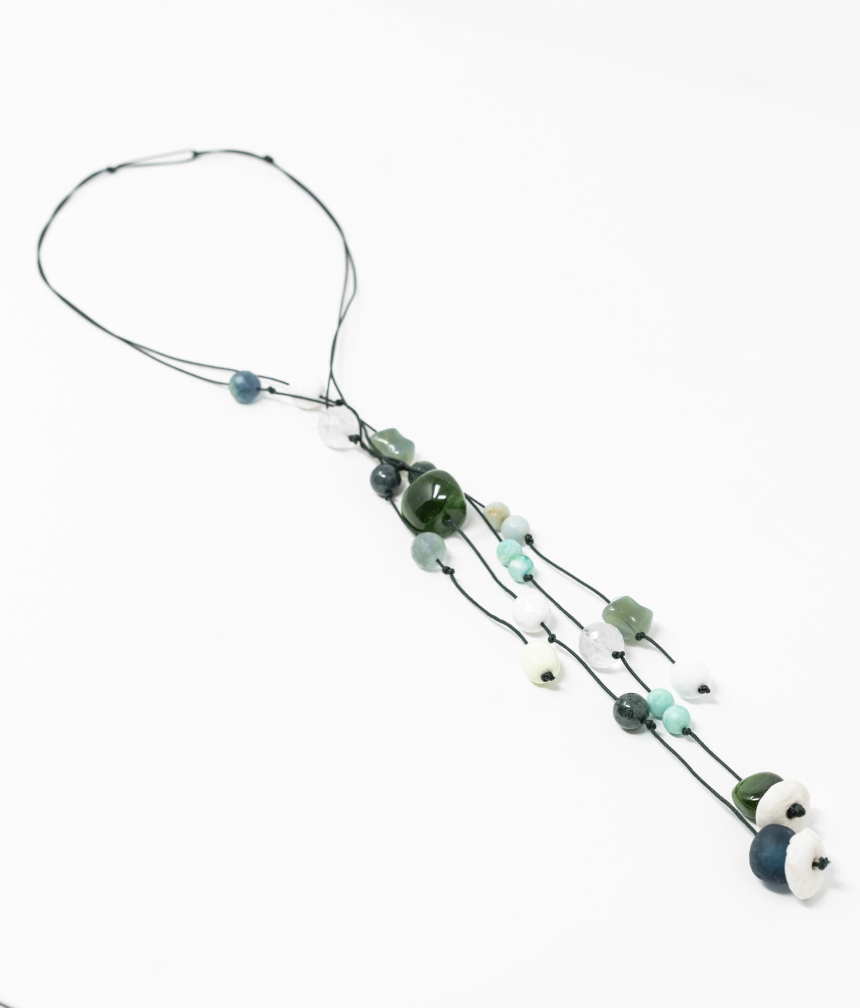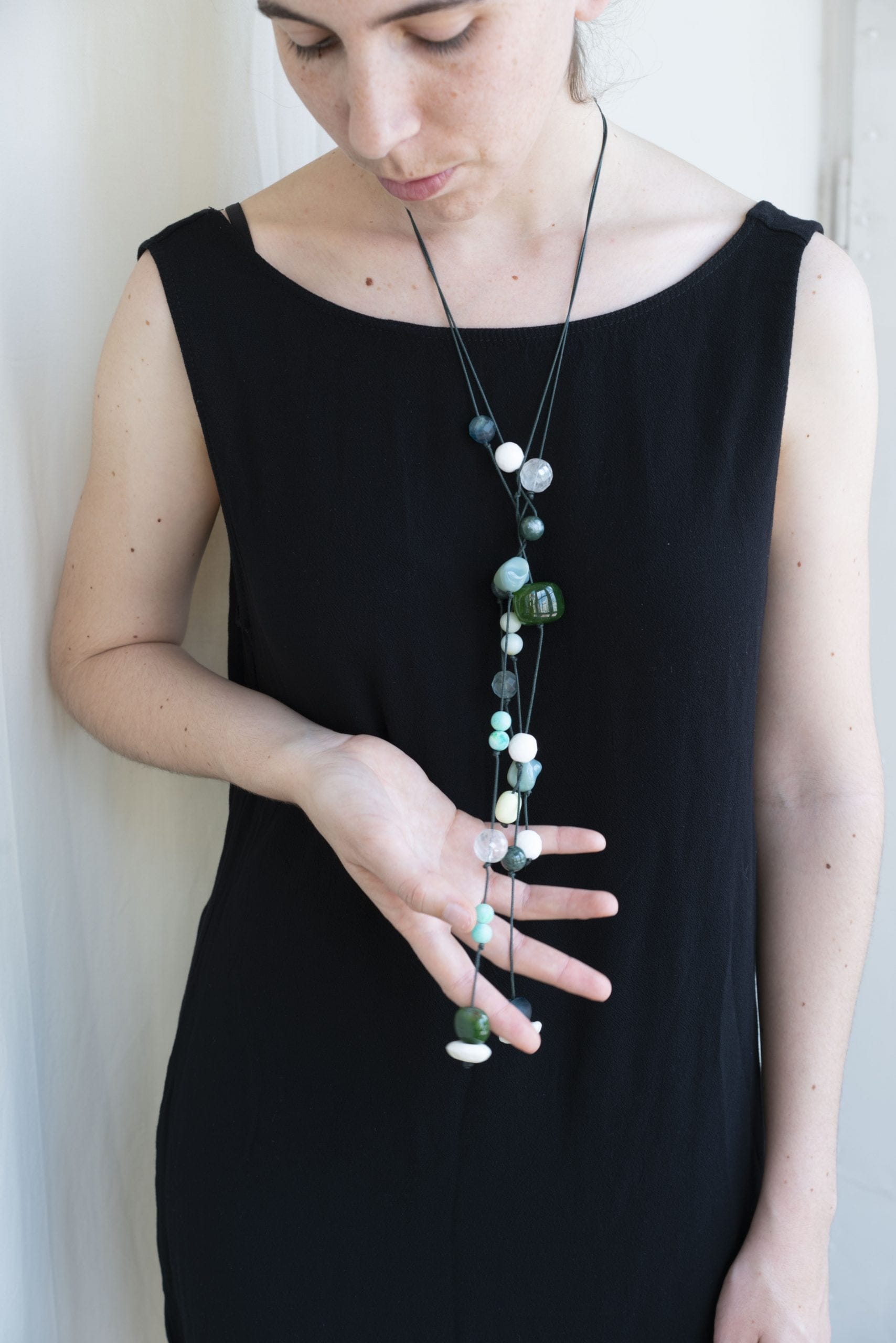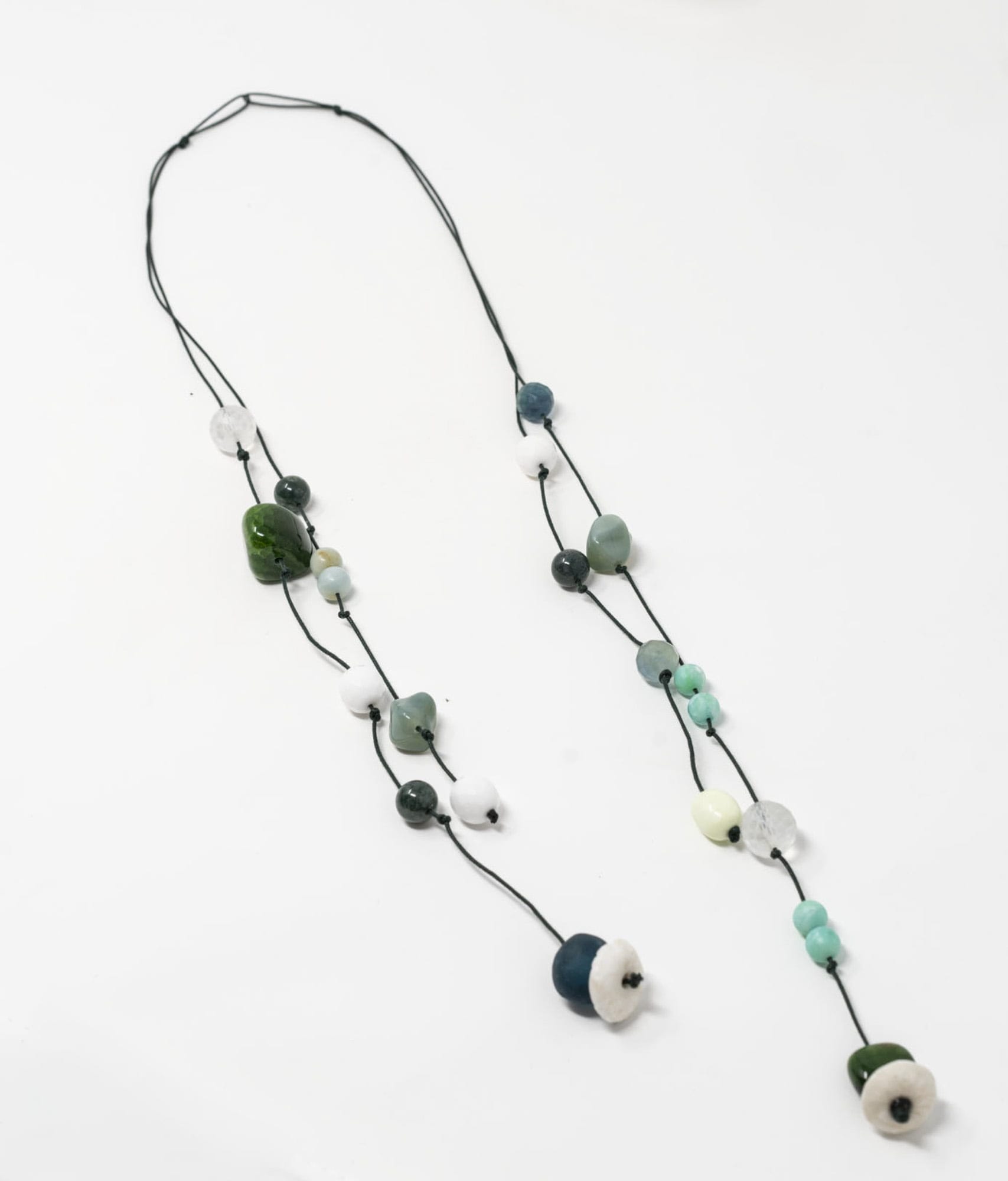 Collar largo de cuatro tiras desiguales para anudar o dejar sueltas, con minerales, cristal tallado, vidrio africano o resinas. Disponible en tonos verdes y en blanco y negro.