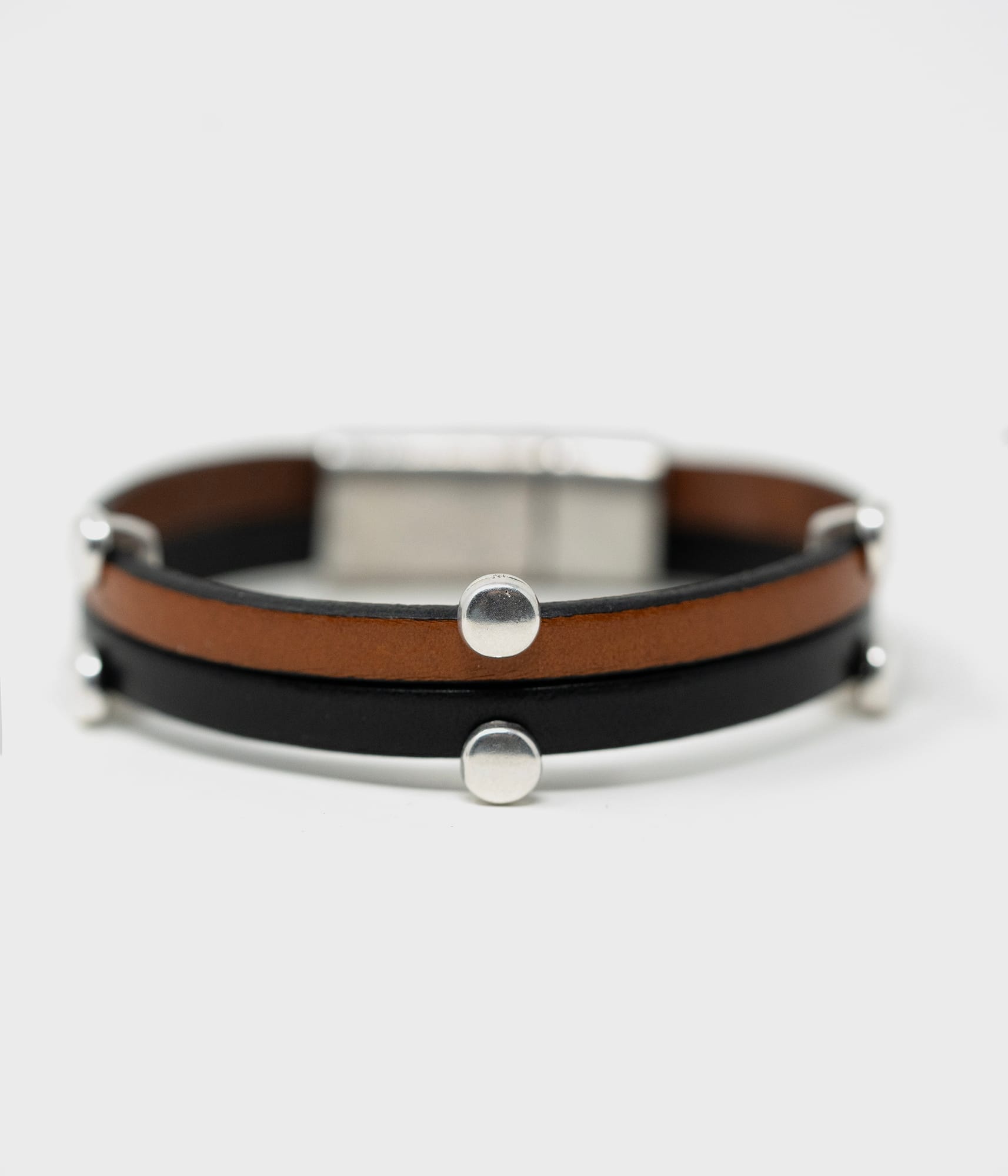 Diseño moderno y funcional con dos tiras de cuero que se combinan elegantemente con un cierre de imán para mayor comodidad. Detalles en forma de puntos adornan la pieza, aportando un toque sutil y contemporáneo. Ideal para complementar cualquier estilo con sencillez y carácter.