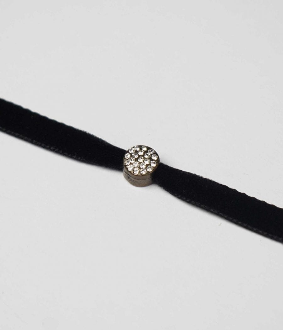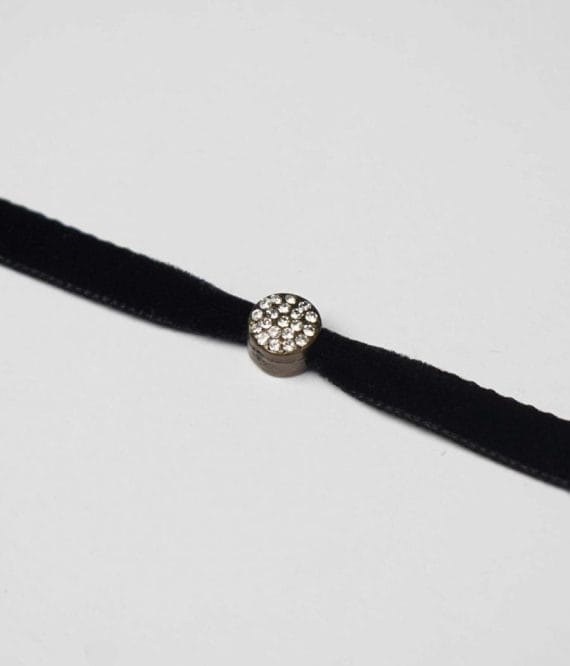 Gargantilla de terciopelo con colgante de cristal tallado. Muy juvenil. Cierre y cadena para ajustar la medida de zamak bañado en plata. Disponible en negro, verde y marrón.