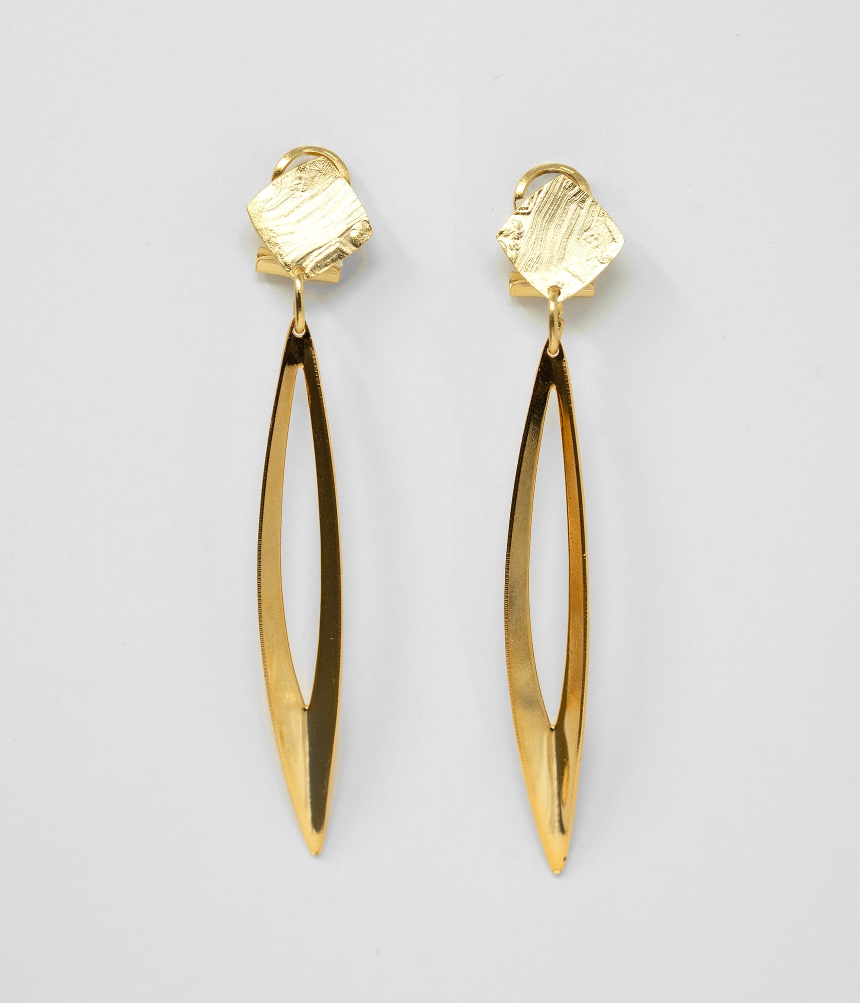 Pendiente largo estilizado, elegante y ligero. Bañado en oro o plata según modelo.