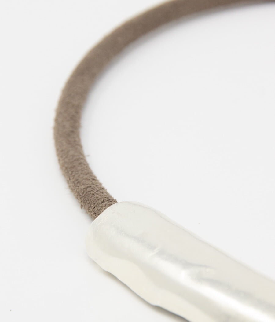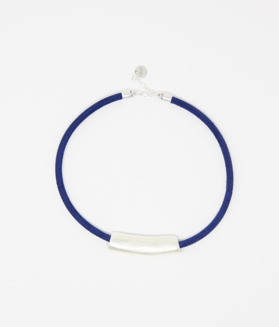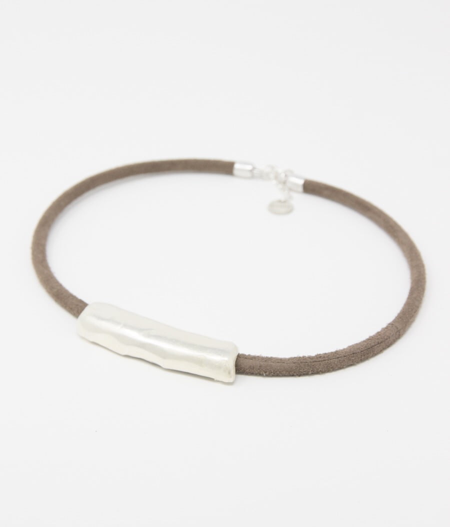 Collar corto de ante tubular con pieza cilíndrica en el centro de zamak bañado en plata. Cierre y cadena para ajustar la medida del mismo material.